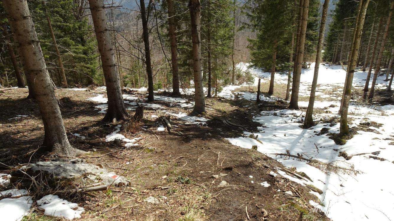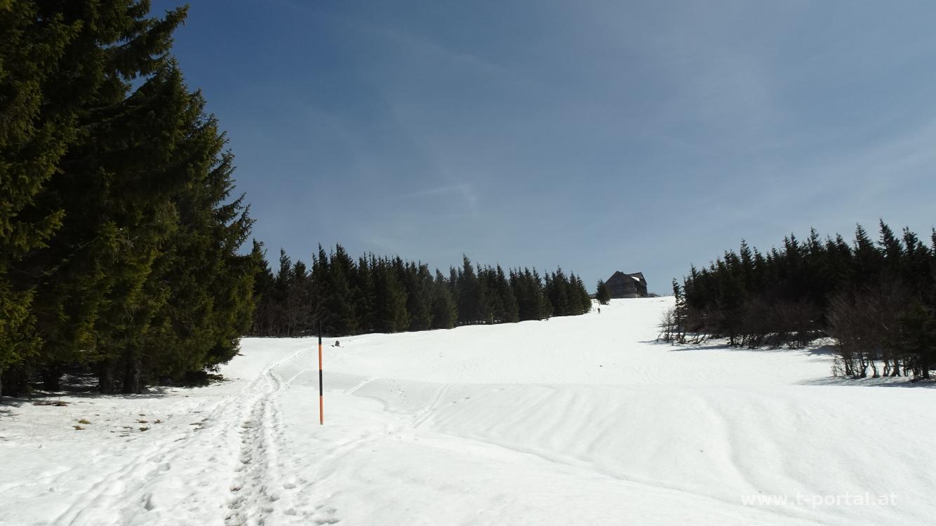 Der erdige Pfad führt nun deutlich steiler hinauf zu den Wiesen der Nagelland Alm. Neben dem Weg sind auch schon erste Schneereste vorhanden. Über die Almwiesen geht es nun hinauf bis zu einem Waldstück. Hier liegt nun das erste Mal mehr Schnee und es rutsch etwas. So erreiche ich die nächste Wiese. Ich folgen den Spuren neben und teils durch den Schnee aufwärts. Weiter oben gibt es noch mehr davon, nachdem der Weg aber gut begangen ist, sinke ich nur selten ein. Das letzte Stück wird es etwas flacher und bald rückt auch das Reisalpenschutzhaus ins Blickfeld. Vorbei an diesem geht es zum Gipfelkreuz, etwas abseits jausne ich die mitgebrachte Stärkung.