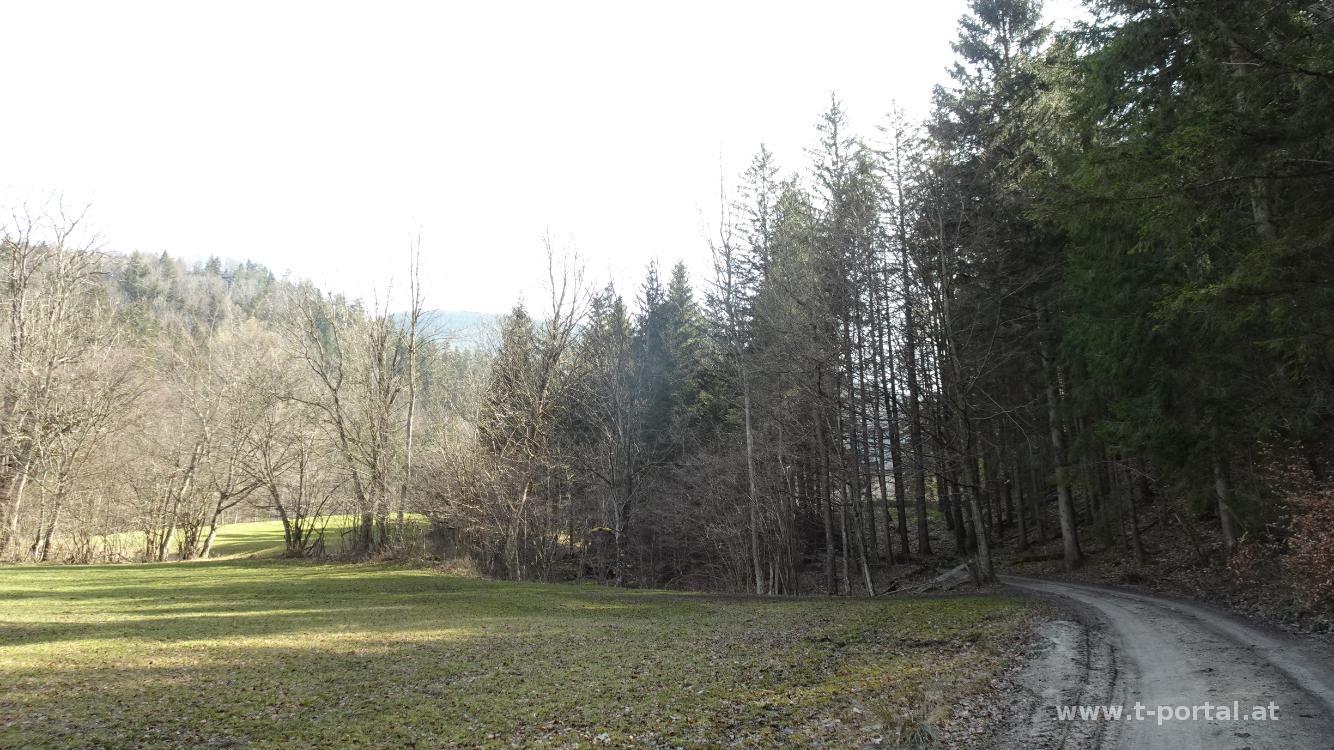 Anschließend geht es am gleichen Weg zurück zur Nagelland Alm, wobei ich mich auf der Wiese dann eher links halte. So gelange ich auf eine Forststraße, der ich aber nur kurz folge und dann gleich nach rechts auf einen rutschigen Waldweg abbiege. Dieser führt mich zu einer Wiese mit Wegkreuzung. Hier wende ich mich nach rechts und folge dem Weg Richtung Furthof/Blümelhof. Bald zweigt ein Wanderweg von der Forststraße ab und führt gemütlich hinab. Es geht um eine Kurve, weiter hinab bis zu einem Kreuz, gerade an diesem vorbei und wieder etwas hinauf. Anschließend durch schönen Wald immer etwas auf und ab.