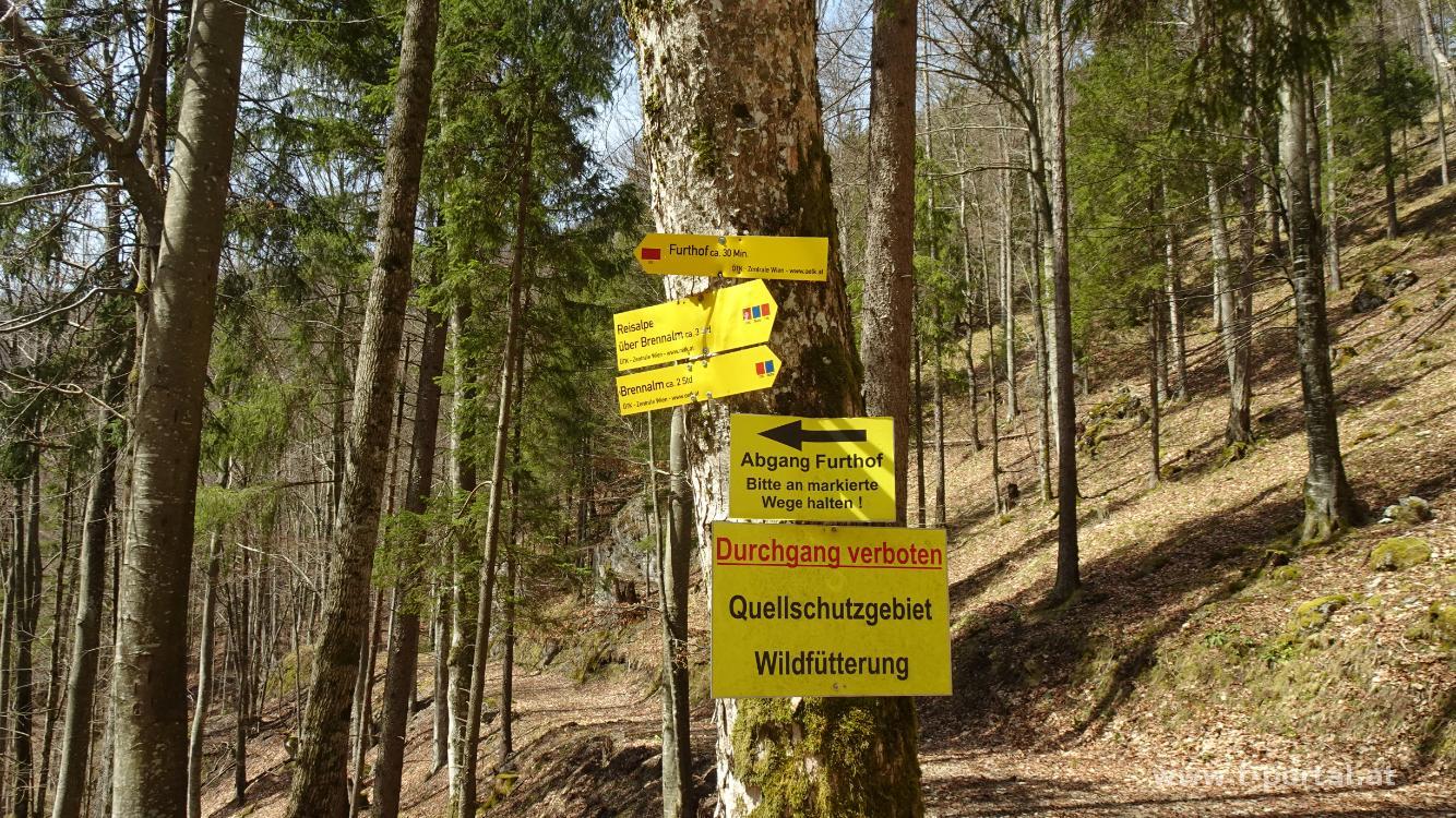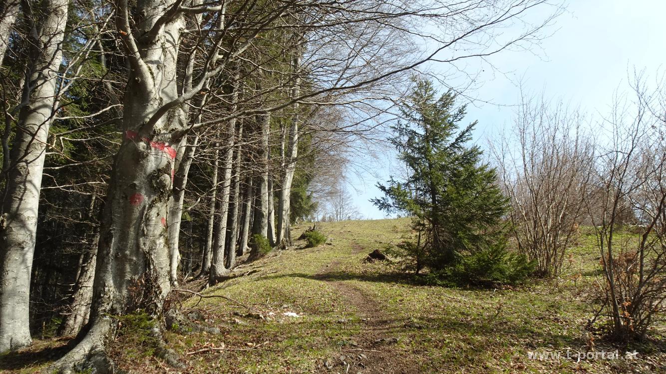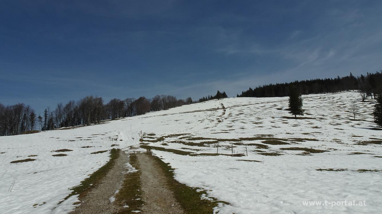 Es gibt ja doch noch ein paar Anstiege auf die "klassischen" Gipfel Niederösterreichs, die ich noch nicht begangen wird. Wie zum Beispiel den Weg von Innerfahrafeld auf die Reisalpe. Das liegt in diesem Fall wohl auch an dem hohen (Forst)Straßenanteil. Aber probieren kann man es ja mal. Ich starte die Runde am Ortsanfang von Innerfahrafeld und folge von dort der Asphaltstraße den Bach entlang. Nach einem Bauernhof geht es mehr in den Wald und etwas mehr bergauf. Nach ein paar Kurven erreiche ich nach etwa 1,5km das Ende der Asphaltstraße. Nun geht es auf der Forststraße weiter bergauf. Diese führt durch eine Weide, nach links, vorbei an einem Anwesen, um ein paar Kurven bis zu einer Kehre. Bis hierher (gute vier Kilometer) könnte man mit dem Auto fahren. Für mich geht es vorbei am Schranken gerade weiter. Der Fahrweg ist nicht mehr ganz so ausgebaut wie bisher, nach einigen Minuten treffe ich aber wieder auf eine Schotterstraße, die von der anderen Seite hierher führt. Nach ein paar Metern auf dieser wende ich mich nach links und folge einem Trampelpfad in den Wald.