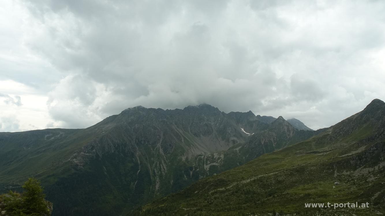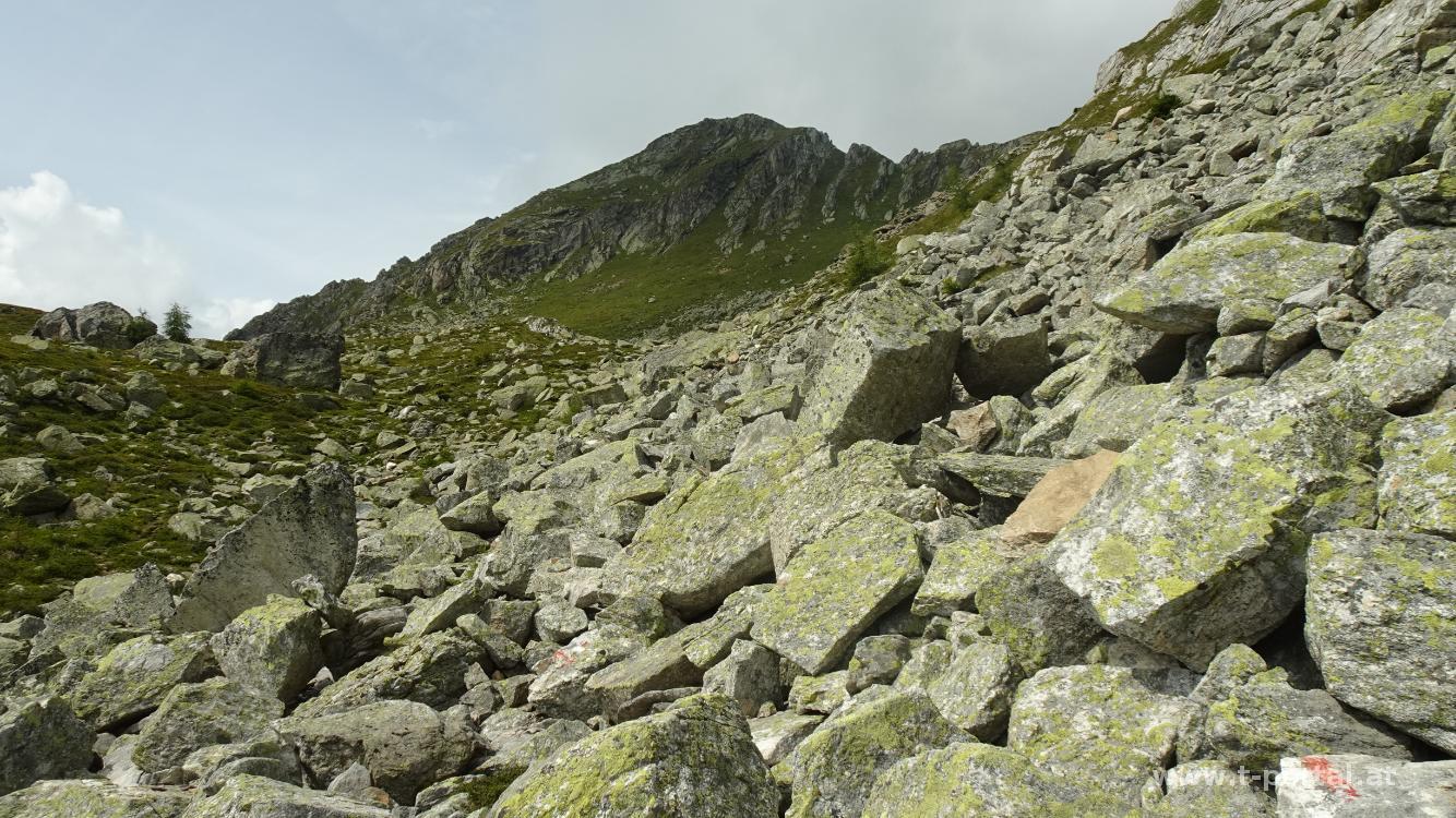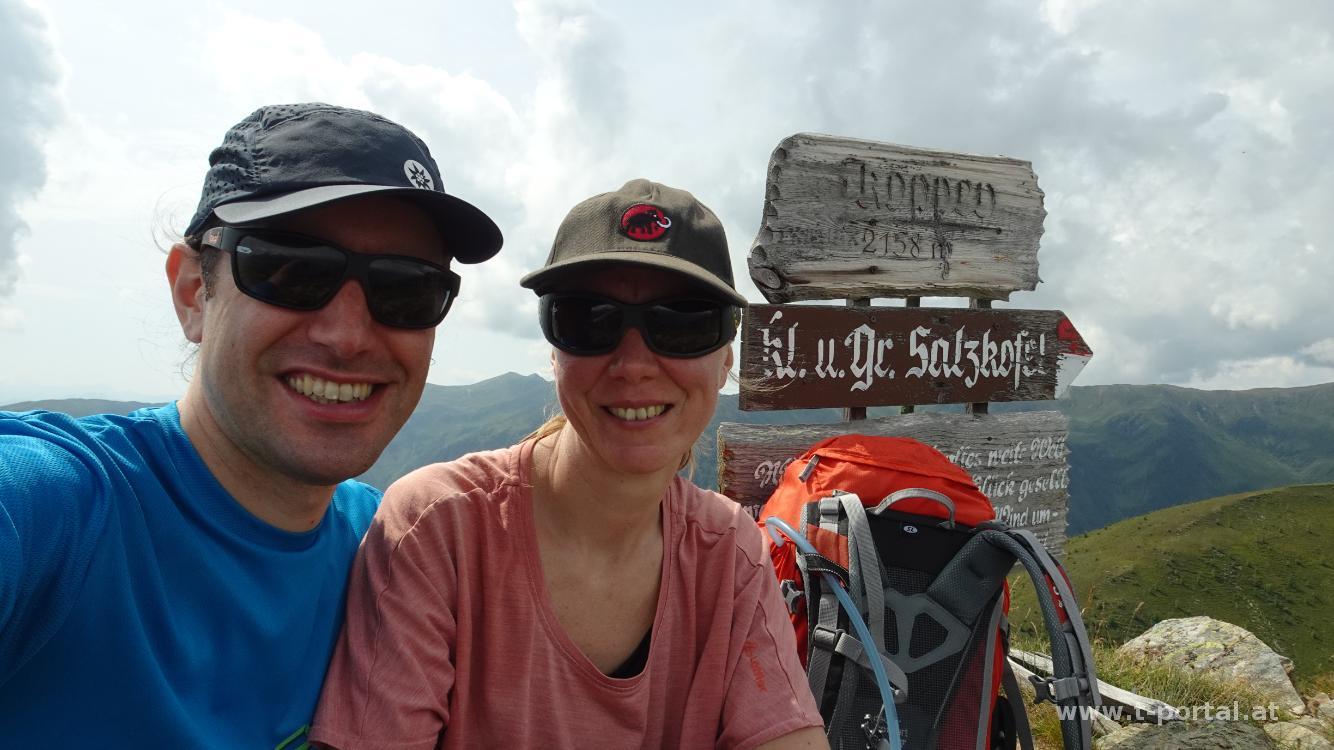 Nach etwas hin und her und kurzem Kartenstudium entscheiden wir uns für den Anstieg nach rechts – je nach Wetter können wir oben noch immer abkürzen und nicht alle Gipfel mitnehmen. Am Weg zum ersten Gipfel müssen wir jedoch einige Zwischenstopps einlegen, da der Weg durch ein Feld mit leckeren Heidelbeeren führt, die wir uns nicht entgehen lassen können. Nach dem Anstieg auf den Koppen sehen wir bereits, dass in einiger Entfernung die Wolken mehr werden. Darum geht es nach kurzer Pause auch über Wiesen- und Steinwege weiter zum nächsten Ziel - dem kleinen Salzkofel. Auf der anderen Seite geht es unmarkiert hinab und wir müssen schon genau schauen, um einen Pfad zurück zum markierten Wanderweg zu finden. Auf diesen geht es nun mehr auf als ab bis zum nächsten Abzweiger. Nach rechts würde der Weg auf den Salzkofel führen. Angeblich benötigt man für die 200 Höhenmeter hinauf noch eine dreiviertel Stunde. Dies ist uns aufgrund des nahenden Regens zu viel und wir gehen geradeaus und später nach links weiter. Es geht nun (durch weitere Heidelbeerfelder) nur noch hinab bis zur Salzkofelhütte.
