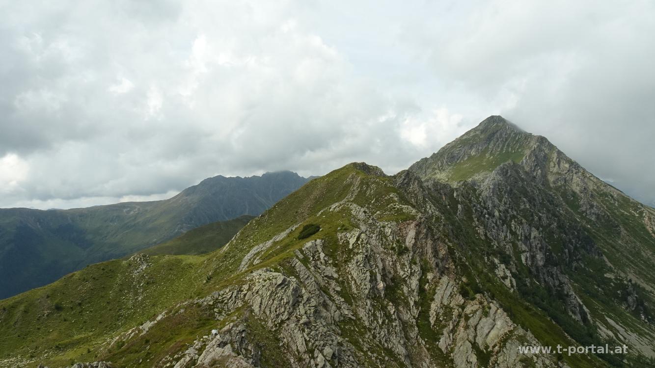 Nach den Almhütten geht es am Wanderweg weiter bergauf in den Wald. Wir treffen ein paar Kühe, verlassen den Wald und sehen die nächsten Rindviecher auf einer Alm. Über eine Straße geht es zu einer Tränke und auf einem Waldpfad weiter hinauf. Nach weiterem Anstieg erreichen wir die erste Kreuzung mit Entscheidungsmöglichkeit: Geradeaus geht es flacher über Almen zu unserem heutigen Ziel - der Salzkofelhütte. Rechts hinauf gibt es die Möglichkeit noch ein paar Gipfel zu sammeln, bevor es hinab zur Hütte geht. Bei der Kreuzung treffen wir auf zwei Damen aus Deutschland, die in den nächsten Tagen die gleichen Strecken wie wir begehen - Auch sie sind am Kreuzeckhöhenweg unterwegs.