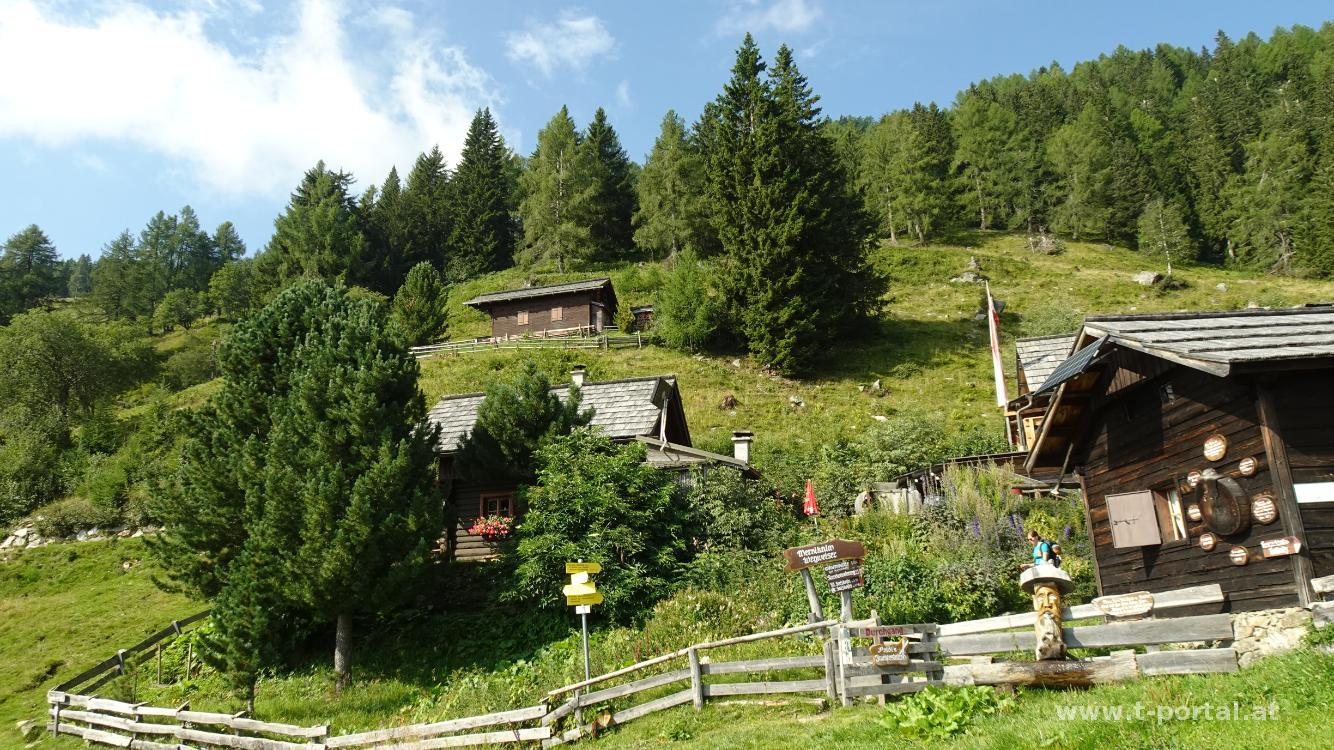 Unsere diesjährige mehrtägige Hüttentour führt uns durch die Kreuzeckgruppe von Kärnten nach Osttirol. Heuer sind Klaudia und ich alleine unterwegs. Wir starten unsere Tour gemütlich und lassen uns die ersten 600 Höhenmeter von der Kreuzeckbahn zum Beginn unserer Wanderung bringen. Von der Bergstation der Bahn geht es vorbei am Speicherteich auf einer Forststraße in den Wald. Neben dem Pfad sind einige Schilder mit Gedichten angebracht. Diese zu lesen hält uns etwas auf, damit wir nicht zu sehr ins Schwitzen kommen. In einer Kehre verlassen wir die Straße und folgen einem Waldpfad gerade aus weiter. Wir queren mehrmals die Straße und kommen dann zur Mernikalm mit Jausenstation.