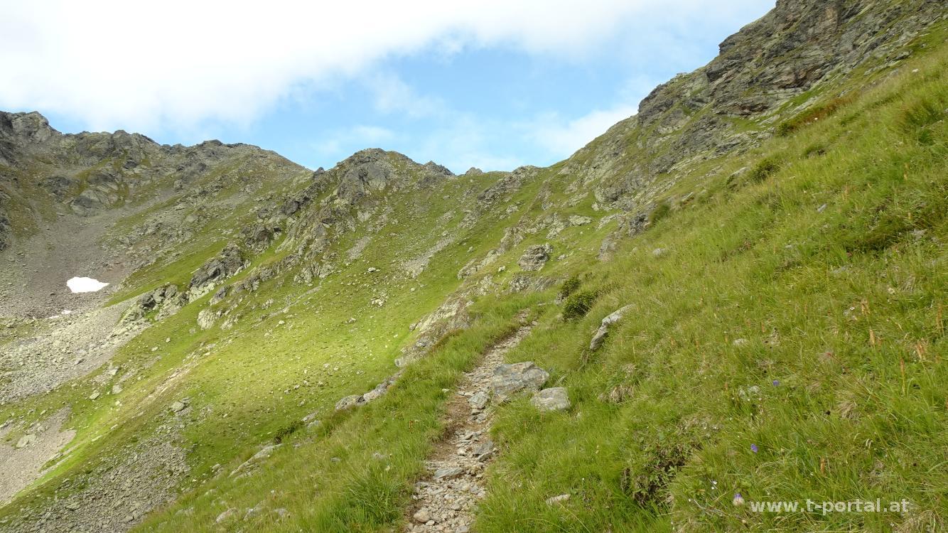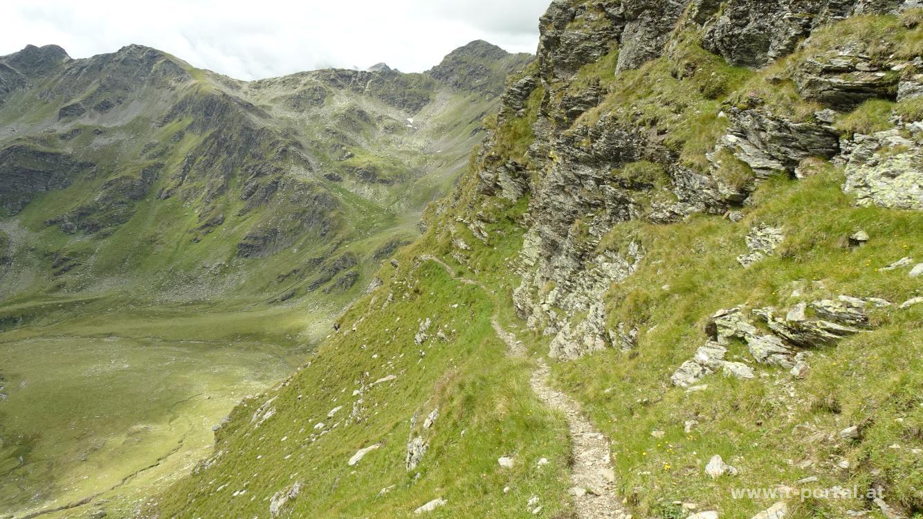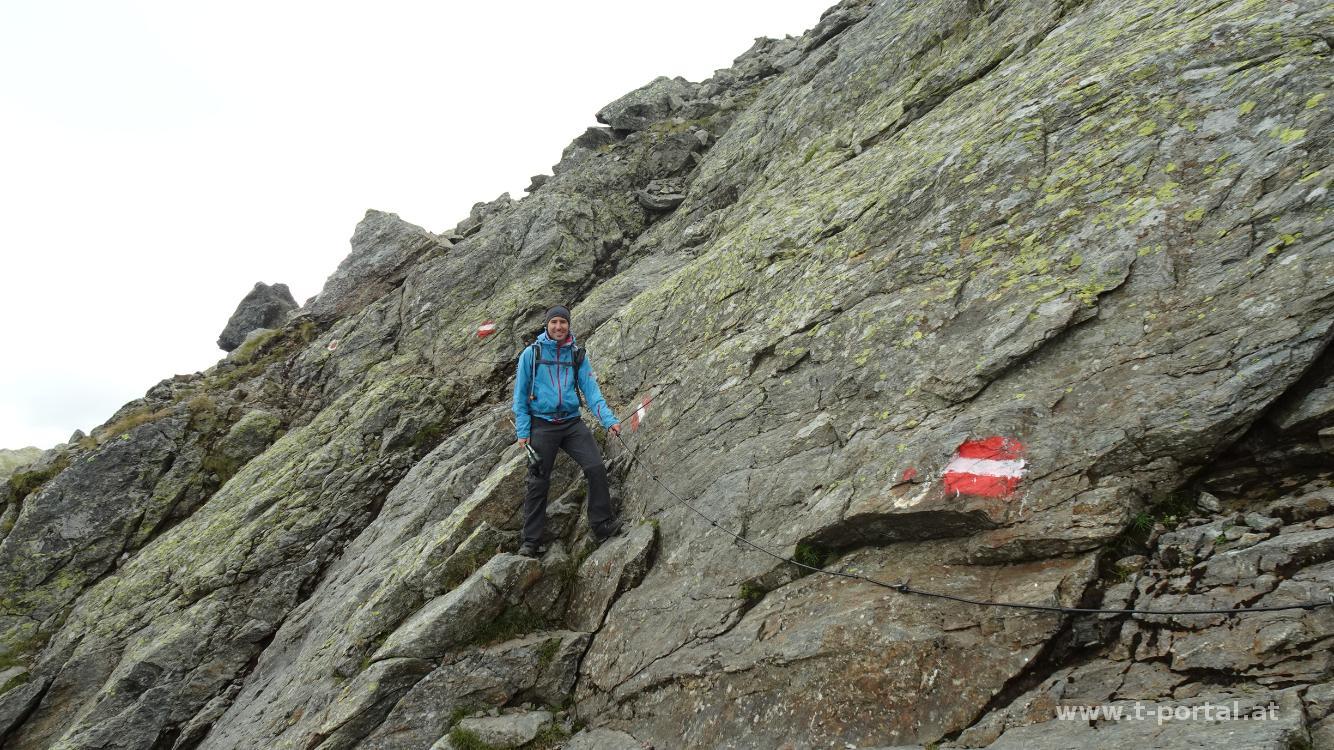 Heute steht die „Königsetappe“ auf dem Plan. In der Tourenbeschreibung waren alle Etappen als schwer eingeordnet. Die Mittleren drei sind es auf jeden Fall und die heutige ist im Rückblick die Anspruchsvollste. Aber von vorne: Los geht es (wer hätte damit gerechnet) bei der Feldnerhütte. Von dort geht es (auch wenig überraschend) bergauf. Hierbei haben wir am Anfang das Gipfelkreuz des Hochkreuzs rechts von uns im Blick. Ursprünglich haben wir uns noch überlegt, dieses heute zu besuchen, nachdem ich aber ziemlich schlecht geschlafen hab, lassen wir das aus. Somit geht es über Wiesen und Stein hinauf, bis wir, wie schon gestern, auf die andere Seite des Felszugs blicken. Zahlreiche Seen tauchen rechts unter uns auf. Der vorerst höchste Punkt ist noch nicht erreicht und so geht es teils neben dem Abgrund weiter hinauf, bis wir das Glenktörl erreichen. Hier steigen wir ausgesetzt um ein Eck und durch ein Felsentor. Von hier geht es nun steil hinab, wobei das angebrachte Seil an anderen Stelle hilfreicher wäre. Nach dem kurzen Abstieg folgt der wohl ausgesetzte Teil der Tour. Links neben der Felswand und rechts vom Abgrund geht es über den 14 (je nach Zählweise derzeit auf 18) Seen dahin.
