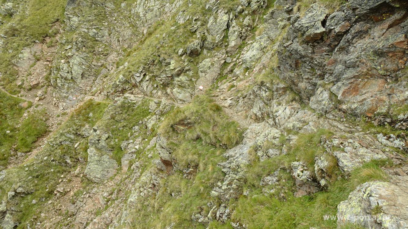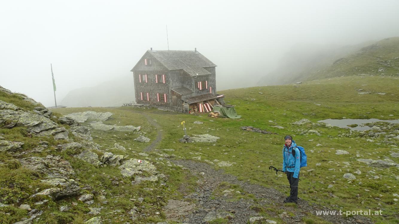Wir steigen nochmal über eine Felskuppe hinauf und anschließend erneut auf schmalen Pfaden entlang der Felswände dahin. Der Regen lässt nach und noch sind die Pfade trocken. Ein Eck ist nochmal besonders ausgesetzt - bei einer abschüssigen Stelle dürften ein paar Steine verloren gegangen sein und ohne großen Halt schiebt man sich über die erdigen Felsen. Anschließend wieder wie gehabt über kurze An- und Abstieg und entlang der Felswände dahin. Irgendwann erreichen wir dann doch das Ende dieser Absturzpassagen und beginnen den finalen Abstieg zur Hugo Gerbers Hütte. Bei einem kleinen See beginnt es noch einmal zu regnen und es zieht ziemlich zu. So flott als möglich zischen wir über Wiesen abwärts, im folgenden felsigen Gelände geht es dann nicht mehr so schnell, da rutschig. Immerhin ist es nicht mehr weit, bis wir das Gipfelkreuz über der Hütte entdecken und wenig später diese erreichen.