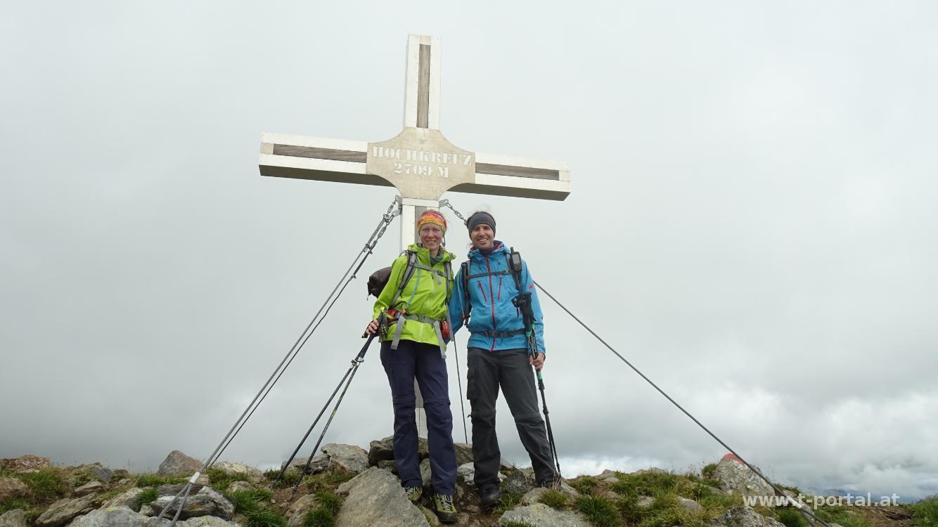 Nach der schwierigen Passage wird das Gelände wieder weiter und es geht nach links und nach kurzem Auf wieder hinab. Wir beobachten ein paar Murmeltiere und sehen schon das Hochkreuz vor uns auftauchen. Vorher besuchen wir aber noch den einzigen Postbriefkasten am Weg, der angeblich sogar geleert wird und legen eine Jausenpause ein. Dabei beobachten wie so oft die Wolken, die durch die Gegend ziehen. Nach der Stärkung näheren wir uns weiter dem Geröllfeld, durch das sich eigentlich ein recht brauchbarer Weg hochschlängelt. Wir erreichen eine Anhöhe und sehen auf die andere Seite des Gebirgszugs. Also theoretisch zumindest – praktisch sehen wir eine Nebelwand. Wir wenden uns nach rechts und steigen die letzten Höhenmeter zum Hochkreuz auf. Das Gipfelgebiet ist mit Schafsdung übersät und somit gehen wir auch bald weiter. Vom Gipfel geht es ein Stück hinab zu einer kleinen Wiese. Hier wollen wir unsere Gipfelrast nachholen, aber nach ein paar Minuten beginnt es zu tröpfeln. Darum schnell ins Regengewand geschlüpft und weiter geht’s.