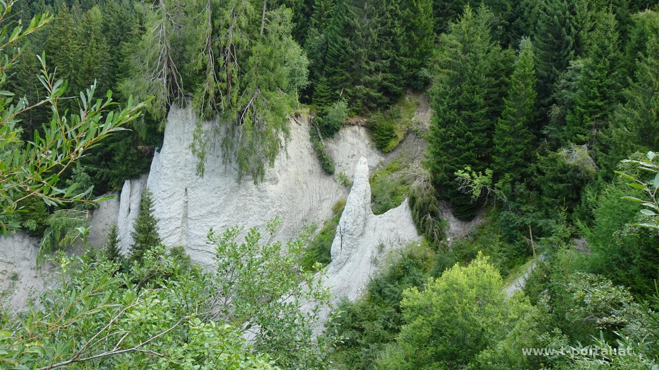 Hier wenden wir uns nach links und folgen dieser etwa 100 Meter, bis rechts daneben wieder ein Wanderpfad neben dem Bach beginnt. Links neben den Bach geht es nun hinab bis zur nächsten Kreuzung. Wir folgen nun der Straße Richtung Erdpyramiden bzw. Eggenweg. Vor der nächsten Bachquerung schickt uns der Wegweiser nach rechts hinab, über eine Wiese, in den Wald und zur nächsten Wiese. Wir kommen zu einem Zaun mit suspekter Kuh dahinter und warten kurz auf ein vorbeikommendes Auto, das die Kühe ein Stück verscheucht. Wir folgen dem Fahrzeug, es geht ein kurzes Stück hinauf und wir erreichen den Aussichtsplatz zu einigen Erdypramiden.