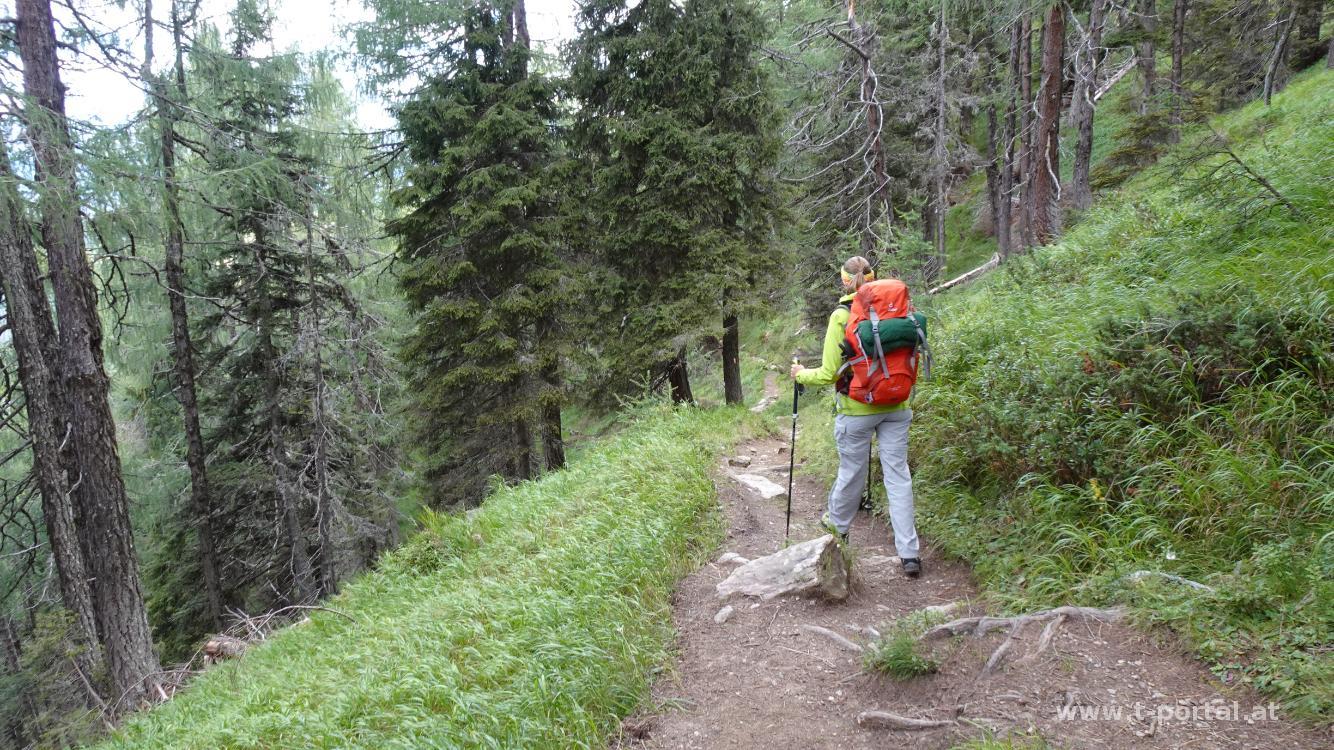 Der letzte Tag unsere Überschreitung führt uns vom Anna-Schutzhaus zurück ins Tal. Wir haben uns als Endpunkt den Bahnhof in Dölsach ausgesucht, da die Rückreise von Winklern (Alternatives Ende) mit den Öffis länger dauert. Bevor wir absteigen gehen wir nochmal ein paar Meter den Weg hinauf und blicken in die gestern noch wolkenverhangenen Berge. Anschließend vorbei am Schutzhaus ein Stück auf der Forststraße abwärts und um die nächste Rechtskurve. Dort zweigt etwas nach rechts der markierte Wanderweg in Richtung Stronach ab. Nun geht es auf einem Waldpfad abwärts. Weiter unten folgen ein paar Kehren, es geht vorbei an ein paar Kühen und schlussendlich zu einer Forststraße.