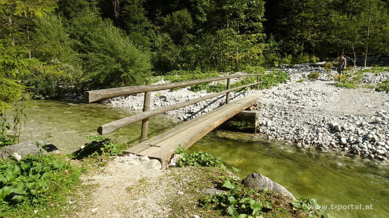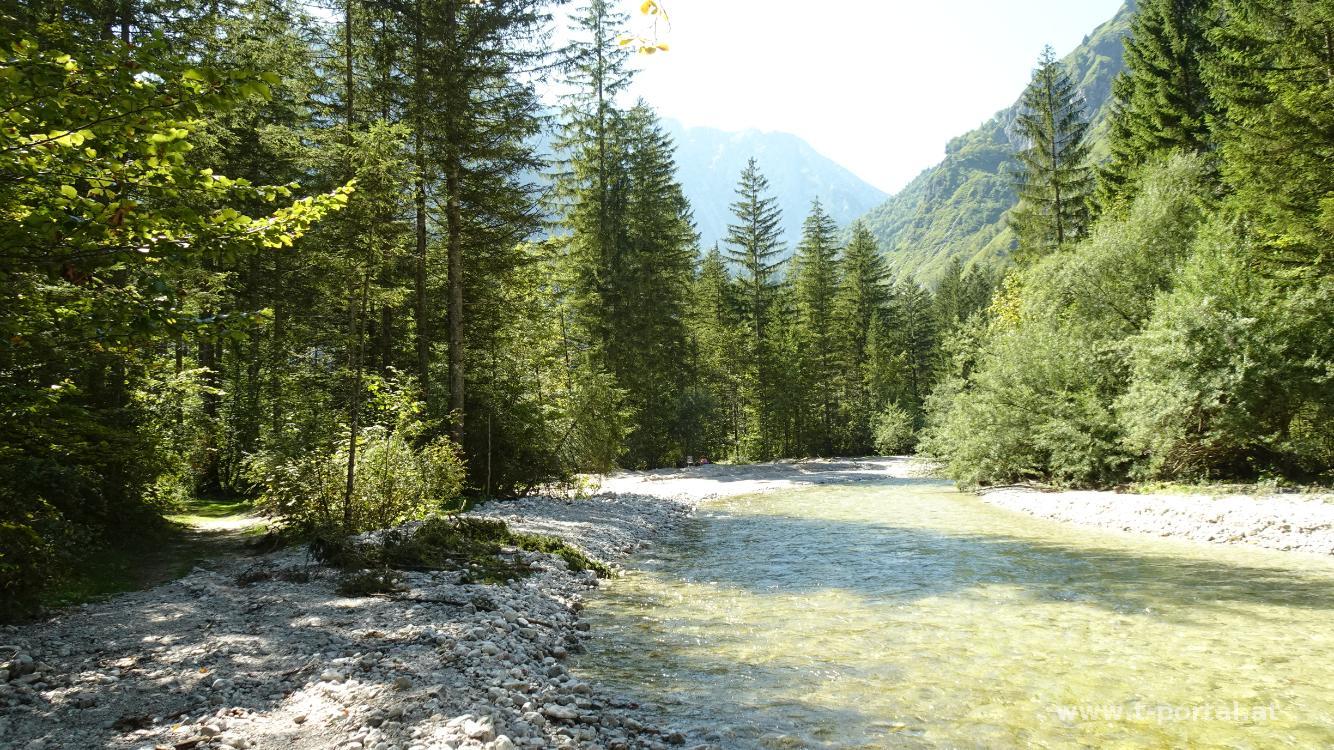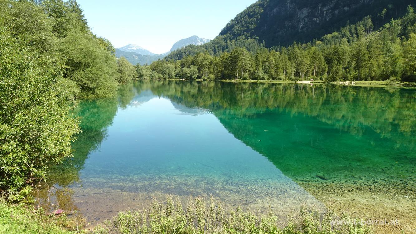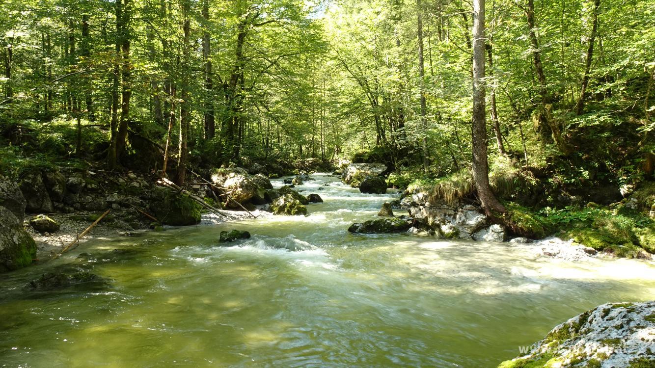 Das türkis-grüne Wasser glänzt im Sonnenschein und wir sind stolz auf unsere Tourenwahl. Nach dem unteren folgt der obere Bluntausee und am Ende von diesem gehen wir auf der rechten Seite auf einen schmalen Waldpfad. Dieser führt uns nun immer in Bachnähe durch den Wald. An einem Mini-Strand legen wir eine kurze Pause ein und gehen anschließend weiter bis zum (heute geschlossenen) Bärenwirt. Auf einer Forststraße geht es nun über eine Brücke und im Wald leicht ansteigend weiter. Hierbei folgen wir immer den Markierungen Richtung Wasserfall.