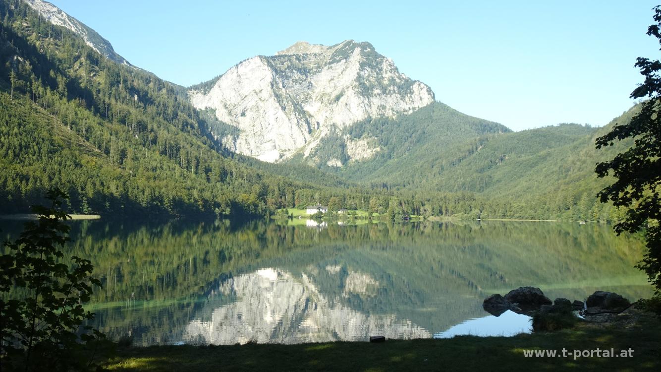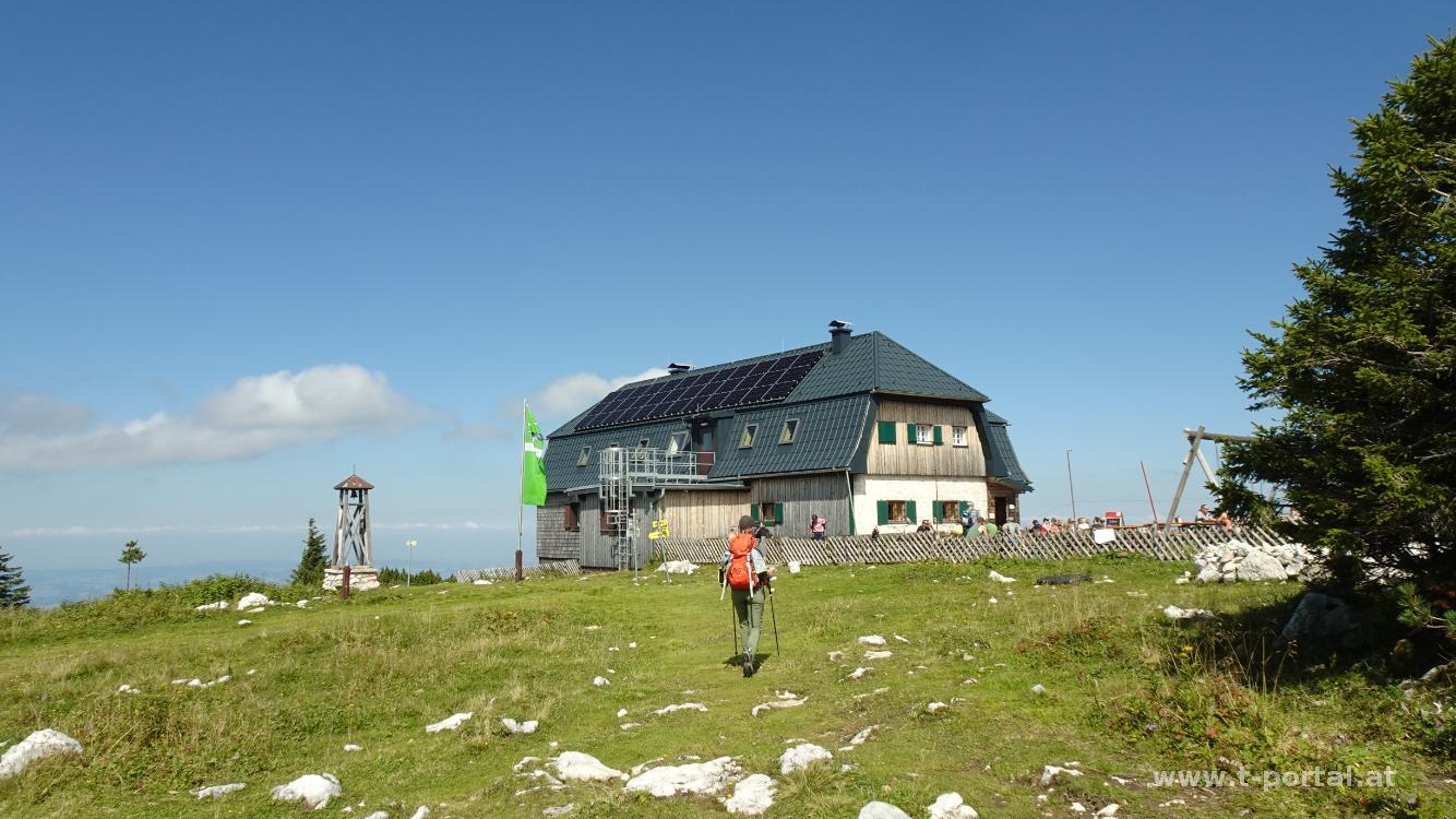 Anschließend geht es ein Stück am Kamm weiter und dann nach rechts hinab zur Wegkreuzung unterhalb des Hochlegenkogels. Wir gehen am Anstieg vorbei Richtung Westen und weiter durch Latschen etwas auf und ab. Bei den weiteren Kreuzung geht es vorbei, bis der Weg sich etwas nach rechts wendet und das Hochleckenhaus zwischen den Latschen auftaucht. Es geht noch ein paar Meter hinauf und schon haben wir die Hütte erreicht. Wir stärken uns mit Kuchen und machen uns anschließend an den Abstieg. Kurz geht es noch flacher dahin, dann geht es steil durch die Felsen hinab. Klaudia und ich sind hier vor einigen Jahren mit den Schneeschuhen herumgerutscht. Nach vielen Kurven errechen wir Waldgebiet. Nun geht es über Schotterwege hinab bis zu einem Brunnen und anschließend über Forstwege bis zum Taferlklaussee. Hier wartet bereits unser Wandertaxi auf uns.