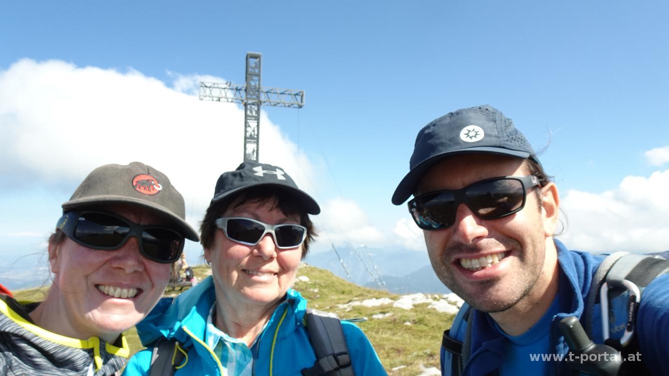 Neben der Wand geht es nun entlang von einigen Drahtsteilen aufwärts, ein paar mal scharf ums Eck bis wir den Unterstand am Ende des schwieriegen Steigstücks erreichen. Nach kurzer Pause geht es im Wald gemütlicher weiter. In einigen Kehren gewinnen wir weiter an Höhe, wandern durch etwas Gestrüpp, durch weitere Kurven und dann gerade weiter. Ein Stück weiter vorne sehen wir dann auch schon das große Gipfelkreuz am Brunnkogel (sieht man auch schon bei den Langbathseen). Wenig später erreichen wir eine Kreuzung, bei der es geradeaus zum Hochleckenhaus geht. Wir wenden uns nach rechts und haben noch immer knappe 400 Höhenmeter Anstieg bis zum Gipfel vor uns. Der Steig führt uns über Stein und durch die Latschen immer weiter hinauf, während über uns zwei Paragleiter kreisen. Oben angekommen legen wir eine Jausenpause ein.