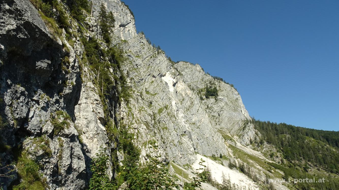 Klaudia wollte auf den Brunnkogel. Mit dabei ist auch Klaudias Mutter Maria. Unser privates Wandertaxi bringt uns zum Parkplatz bei den Langbathseen. Von dort wandern wir am vorderen Langbathsee vorbei und weiter zum hinteren Langbathsee. Diesen umrunden wir halb und kommen zum Einstieg des Schafluckensteigs. Hier stellen wir fest, dass dies der alte Einstieg ist, den man nicht mehr begehen soll (Steinschlaggefahr). Wir folgen dem Umleitungsschild, bis wir den See fast umrundet haben und nach rechts auf eine Forststraße abzweigen. Wenn man beim hinteren Langbathsee gleich nach links über die Brücke abzweigt, kann man die Fastumrundung abkürzen. Nun geht es auf der Straße neben dem Bach dahin, zweimal um eine Kurve und dann rechterhand in den Wald. So kommen wir dann doch zum Schafluckensteig. Dieser führ uns nun über etwas Geröll zur Felswand. Der alte Steig wird dabei zweimal schnell gequert. Mittem im Absturzgebiet steht noch ein Schild, dass auf die Nichtbegehung des alten Steigs wegen Steinschlag hinweist.