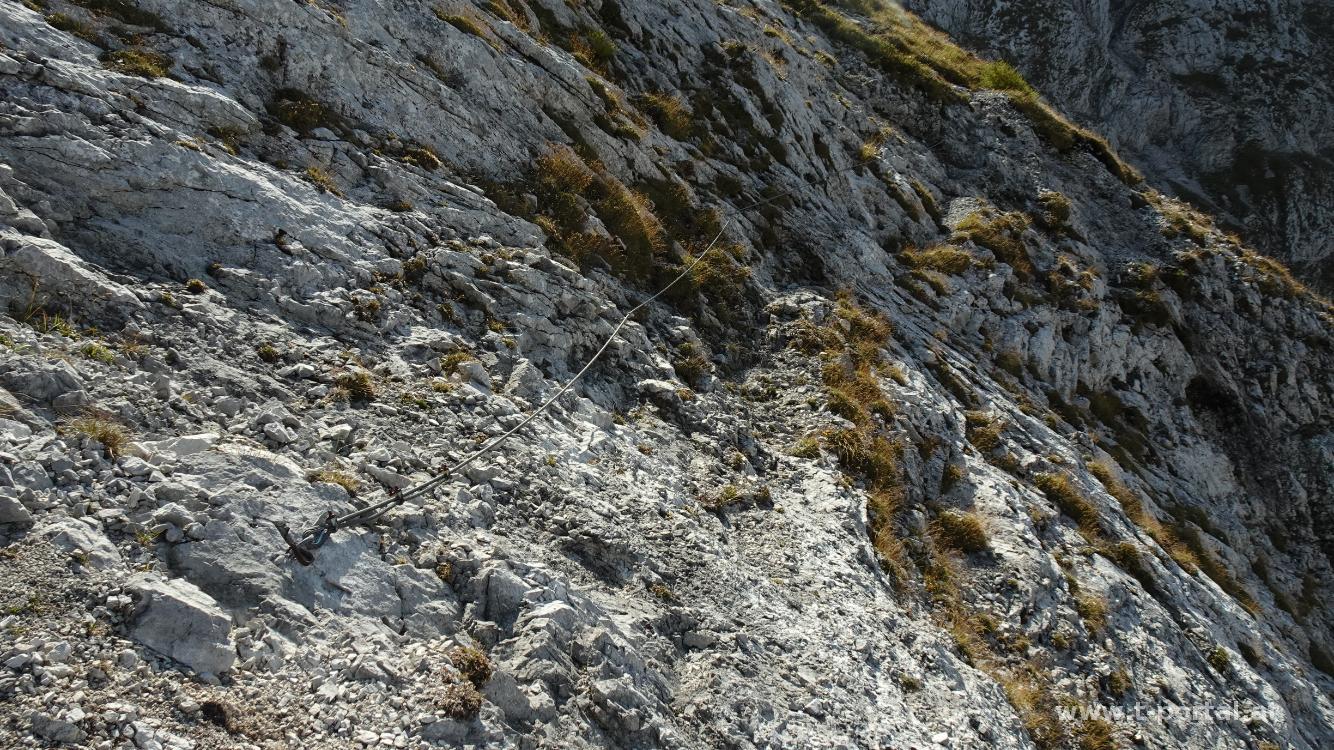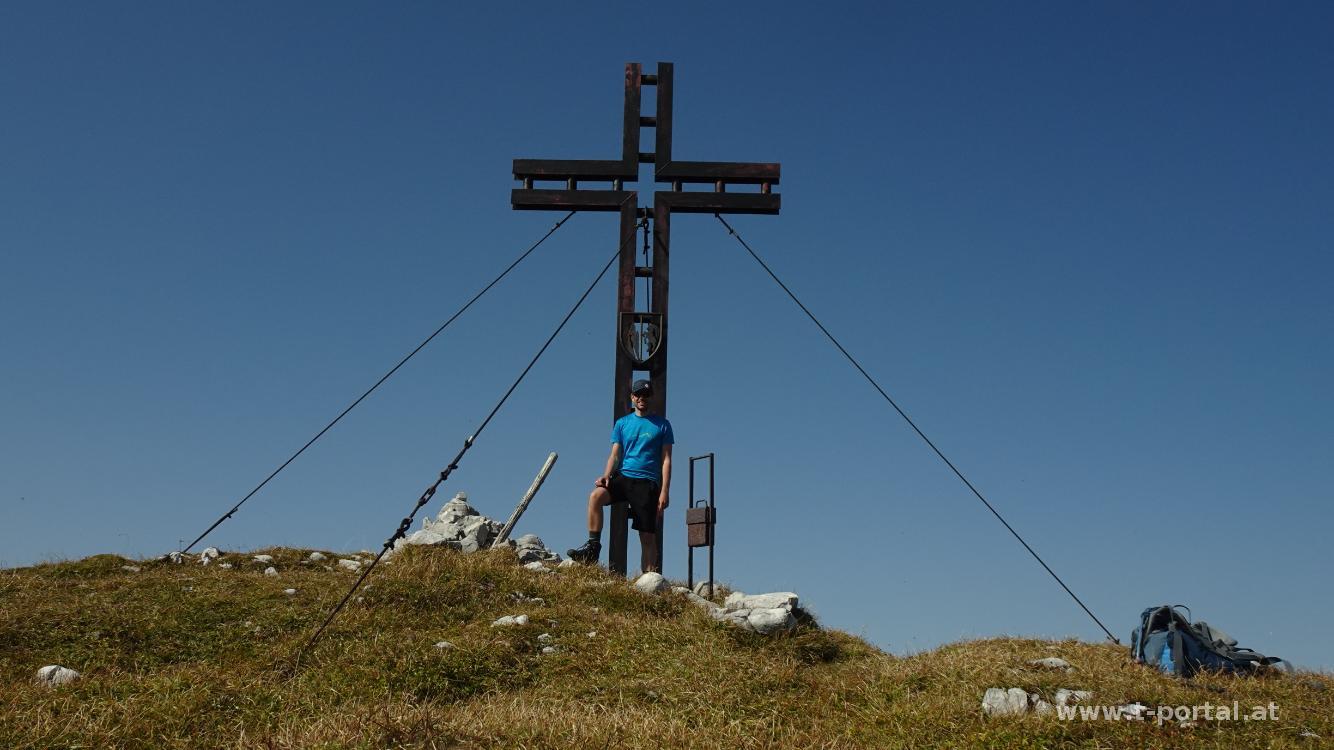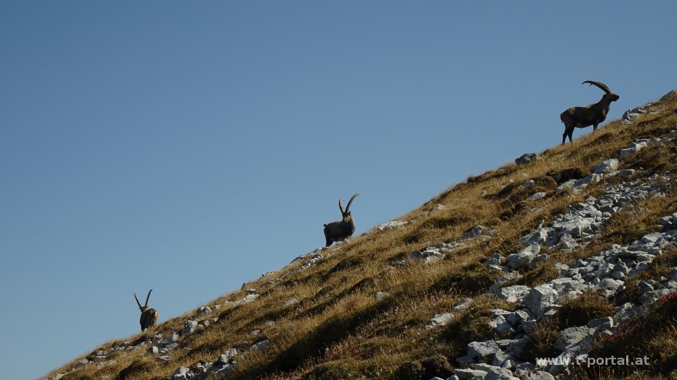 Nach kurzer Rast geht es über einen Grashang etwa 50 Meter hinab in einen Sattel. Hier beginnt der anspruchvollste Teil des Tages. Im Hang geht es etwas ausgesetzt über Fels und etwas Schutt aufwärts. Die Passage ist mit Stahlseilen gesichert, was besonders im Abstieg hilfreich ist. Danach erreicht man bald wieder einen Sattel und es geht nach rechts hinauf Richtung Gipfelkreuz. Hier treffe ich einige Steinböcke, die sich nicht sonderlich gestört fühlen. Der Weg ist hier etwas weniger deutlich zu sehen, aber immer noch gut markiert. Am Gipfel angekommen genieße ich das Panorama und stärke mich mit der mitgebrachten Jause.