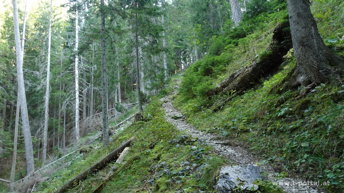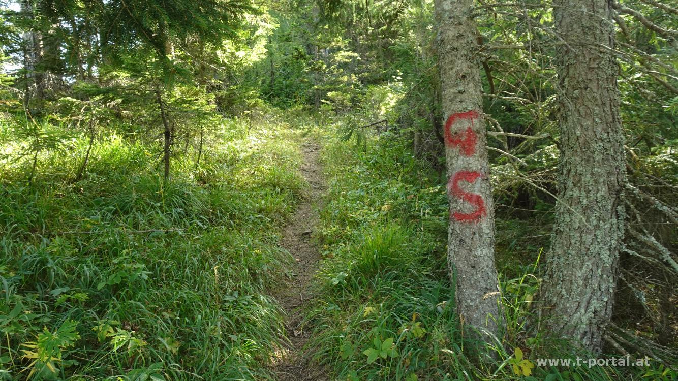 Ich wende mich nach links und folge ein Stück der Forststraße. Nach zwei Kurven und einem kurzen Abstieg zweigt nach rechts ein Pfad ab. Dieser ist mit roten Punkten und "GS" markiert. Der schön angelegte Weg führt nun in vielen Kehren mäßig steil durch den Wald. Weiter oben geht es durch zwei Felsen und die Latschen rücken näher. Auch der Weg wird hier etwas steiniger. Es folgt eine längere Querung Richtung Südwesten durch die Latschen, bis der große Griesstein wieder ins Blickfeld rückt. Hier wende ich nach links und folge den Spuren und Markierungen durch ein paar Felsen hinauf zum kleinen Griesstein. Bereits hier hat man tollen Ausblick zur Riegerin, dem Hochstadl, Hochkar, Eisenerzer- und Gesäuseberge.