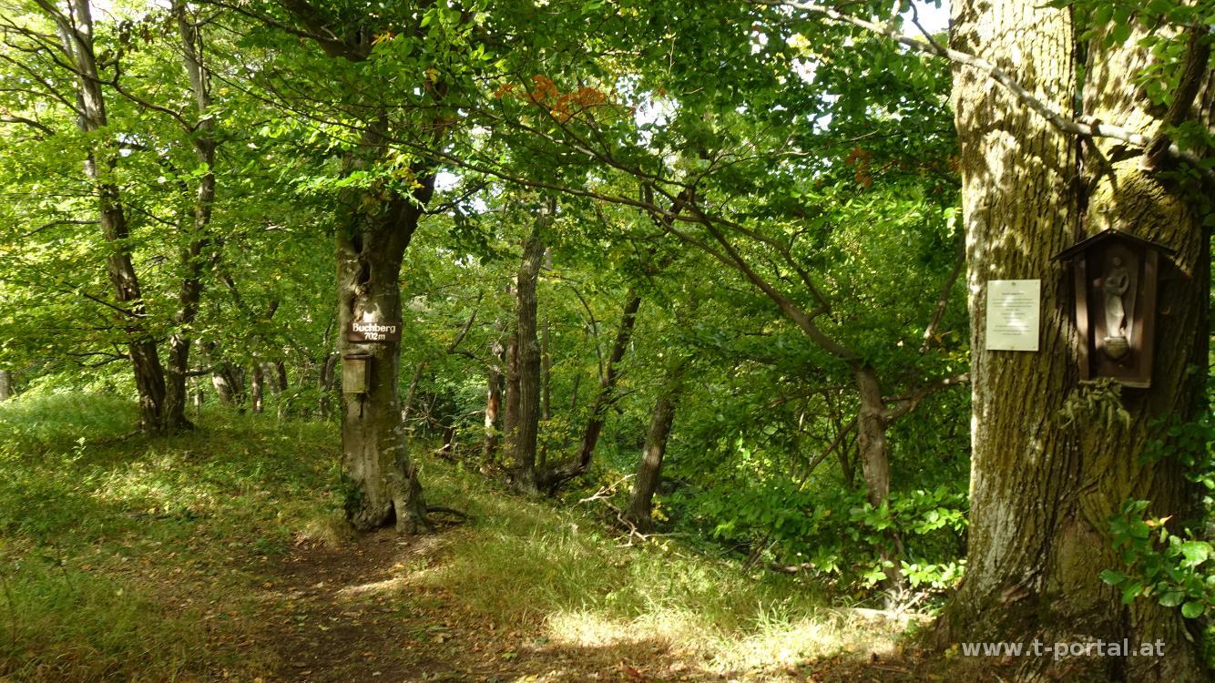 Vom Bahnhof Spitz gehen wir ein Stück durchs Dorf, vorbei an der Kirche und danach rechts durchs Schloß Spitz. Hier starten wir den Buchbergrundweg. Es geht nach links durch ein paar Weingüter und dann rechts die Asphaltstraße aufwärts. Im Rückblick hat man hier Ausblick nach Spitz und zur Donau. Am Ende der Straße geht es auf einen Fahrweg weiter aufwärts.Im (Buchen)wald wird es etwas steiler und nach zwei finalen Kurven erreichen wir den Aussichtspunkt. Nach rechts geht es nun noch einige Meter hinauf zum Gipfel.