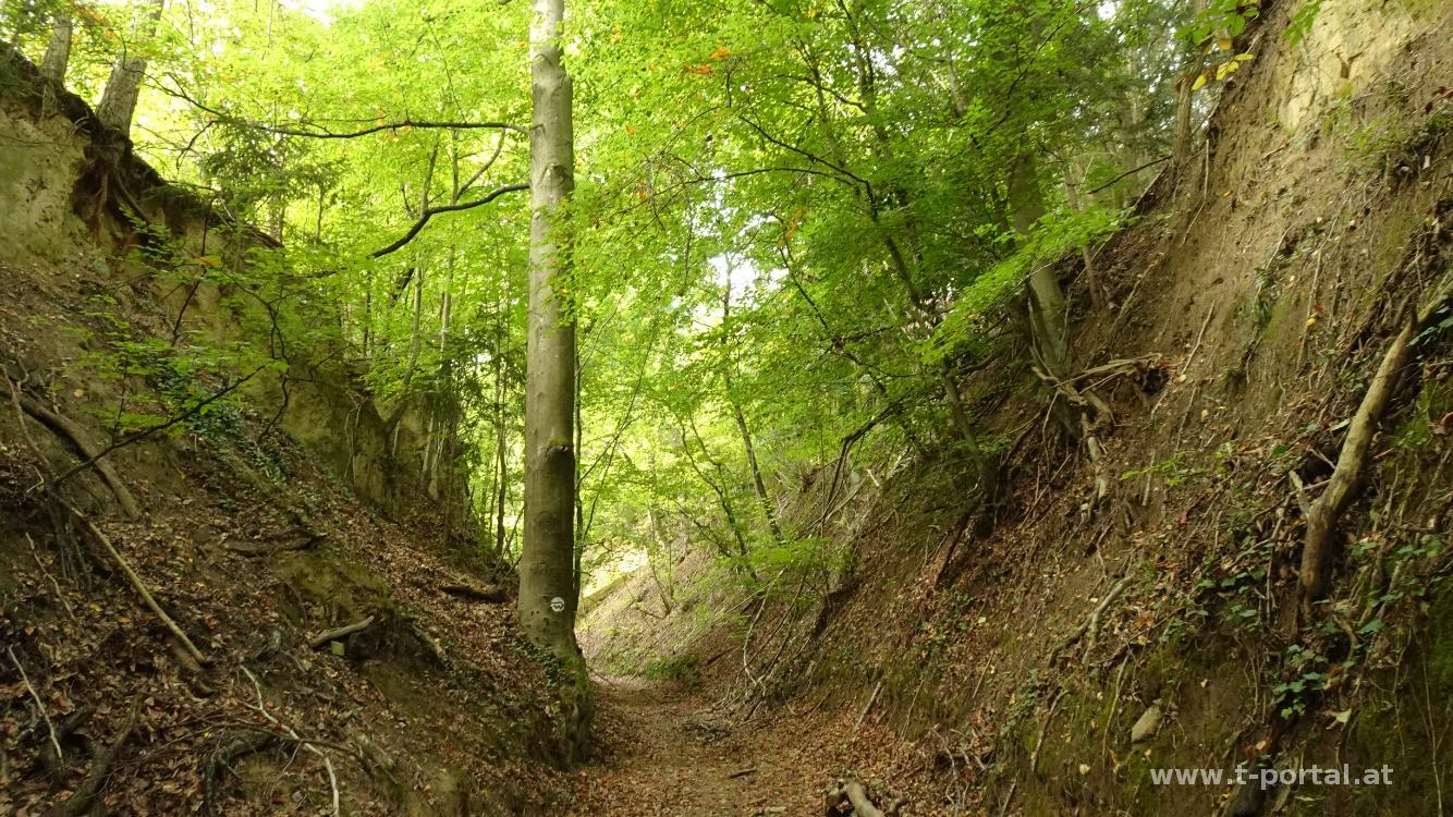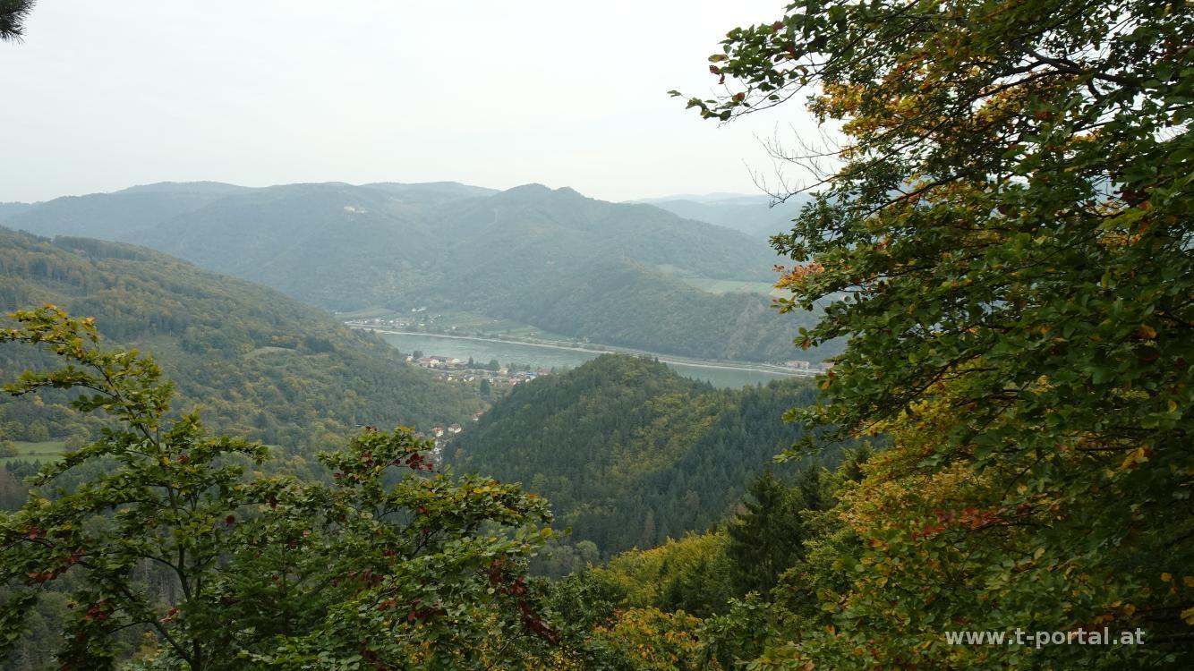Heute wollen wir wieder einen Teil des Welterbesteigs absolvieren und wählen die Route von Aggsbach Markt nach Emmersdorf. Wir starten die Tour bei der Kirche in Aggsbach und gehen von dort ein Stück durch den Ort, queren den Bach und schwenken auf den Welterbesteig ein. Vorbei an ein paar Häusern geht es in den Wald und durch einen Hohlweg aufwärts. Nach dem ersten Anstieg gibt es einen Rastplatz in den Brennnesseln mit Donaublick. Für uns geht es am Weg durch den Wald weiter aufwärts. Aus dem Weg wird weiter oben wieder ein Fahrweg, der uns zu einer Kreuzung führt. Hier ist nach rechts der Fensterfelsen angeschrieben. Nachdem wir noch nie was davon gehört haben, machen wir den kurzen Abstecher und steigen auf einem Waldpfad zu einer interessanten Felsenformation mit Loch und Donaublick. Retour am Welterbesteig geht es auf Forststraßen noch ein Stück aufwärts.