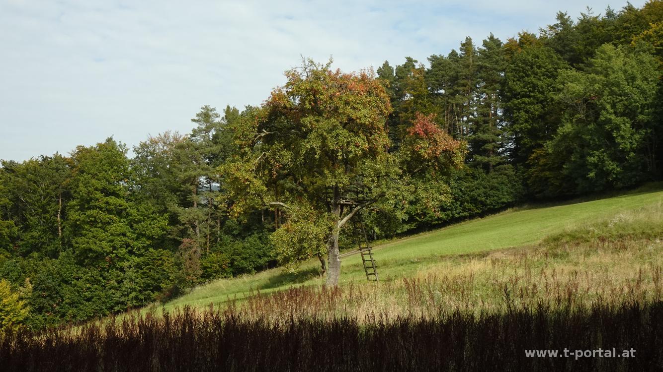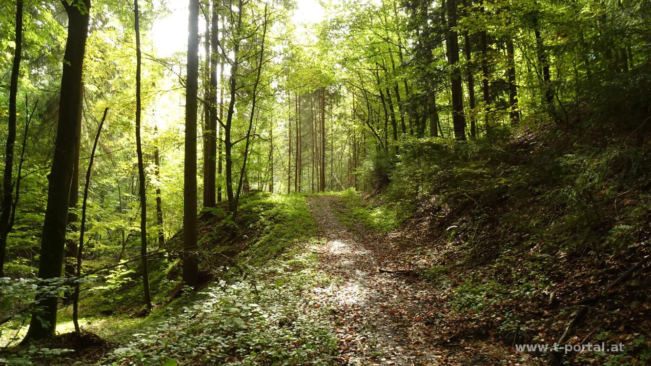 Als wir den Wald verlassen wird aus der Forst- eine Asphaltstraße. Diese führt uns nun neben Feldern und Christbaumplantagen zur Bundesstraße nach Zintring. Wir gehen durch den Ort und bei den letzten Häusern nach links hinab. Nach einer Linkskurve geht es kurz hinauf, durch Wald, vorbei an einer Wiese und anschließend in einigen langen Kurven hinab. Entlang eines Bachs erreichen wir den tiefsten Punkt des Abstiegs und gehen auf der anderen Seite auf einer Forststraße wieder hinauf, bis wir das (ehemalige) Gasthaus Merkl von Felbring erreichen. Wir queren die Bundesstraße, finden eine Bank für die Mittagspause und gehen bei der nächsten Möglichkeit nach links. Durch ein Tor geht es durch eine weitere Christbaumplantage und auf der andere Seite auf schmäleren und bald breiteren Forststraßen hinab. Wir erreichen ein paar Häuser, queren den Bach und wenden uns nach links.