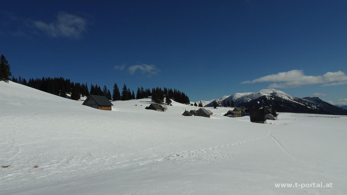 Nach Anstieg in der Sonne erreichen wir diese und wandern über den Schnee weiter Richtung Hinteralm. Nach einer Querung und einer leichen Linkskurve ist der Hang über uns recht abgelasen. Wir bleiben auf der Straße und erreichen bald die ersten Hütten bei der Hinteralm. Wir queren das Hüttendorf und wenden uns nach links hinauf und in Richtung Spielkogel. Nachdem wir durch ein paar Bäume geschlüpft sind gehen wir ein Stück unter dem windigen Kamm über Almwiesen weiter. Nach den letzten Bäumen taucht dann auch das Gipfelkreuz am Spielkogel auf. Gut eingepackt trotzen wir dem Wind und steigen die letzten Meter zum Gipfel auf. Hier hat man schönen Rundumblick in Richtung Schneelam, Gippel, Göller, Ötscher, Gemeindealpe, Prolesen und Königskogeln, Hochschwab, Veitsch und der Lachalpe. Aufgrund des Windes geht es auf der anderen Seite auch gleich ein Stück hinab und weiter in den nächsten Wald. Wir suchen uns eine Schneise und rutschen flott hinab zu einem Sattel. Auf der anderen Seite geht es durch den Wald wieder etwas hinauf. Hier finden wir einen sonnigen und windgeschützten Rastplatz für die Mittagspause.