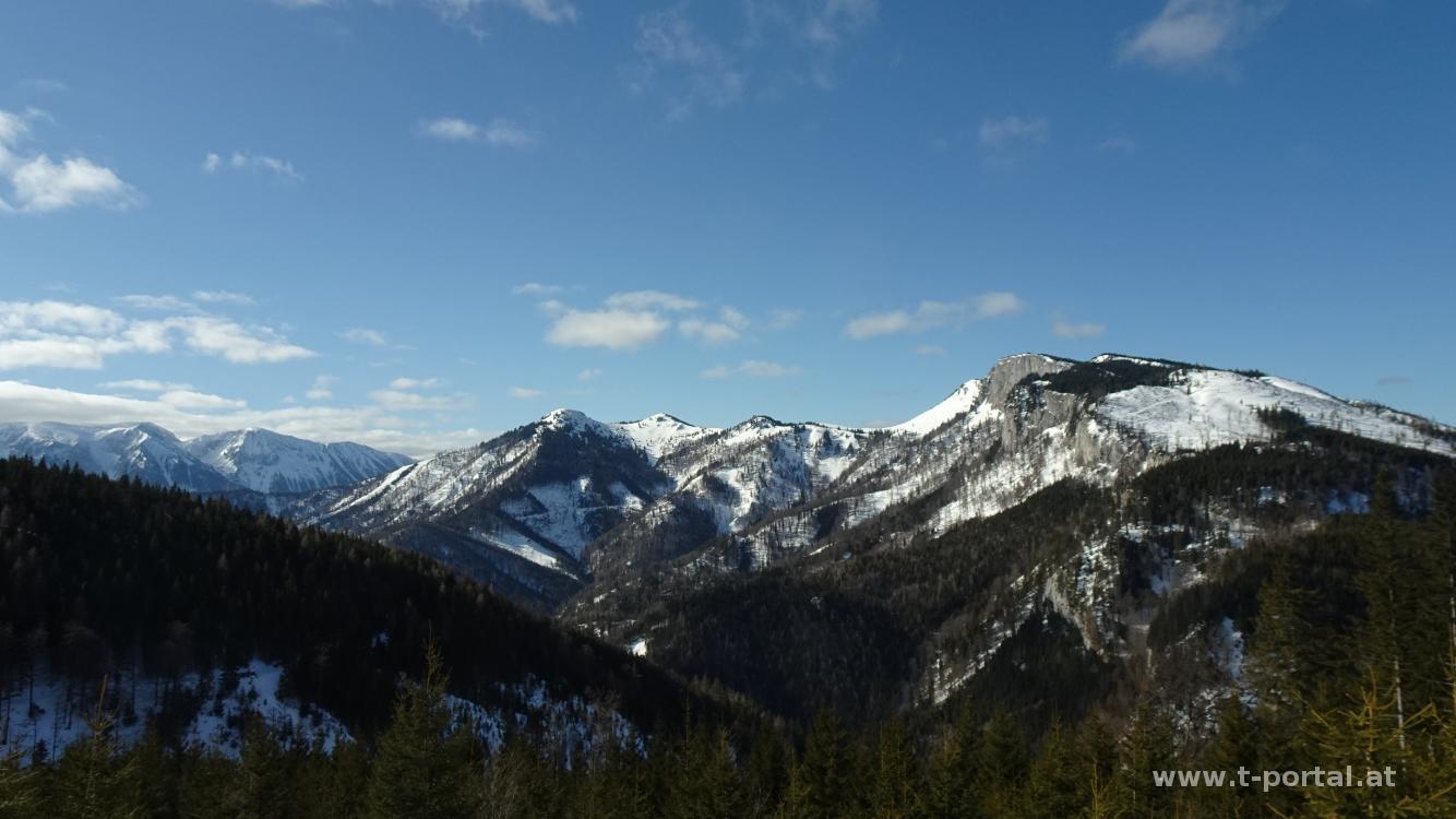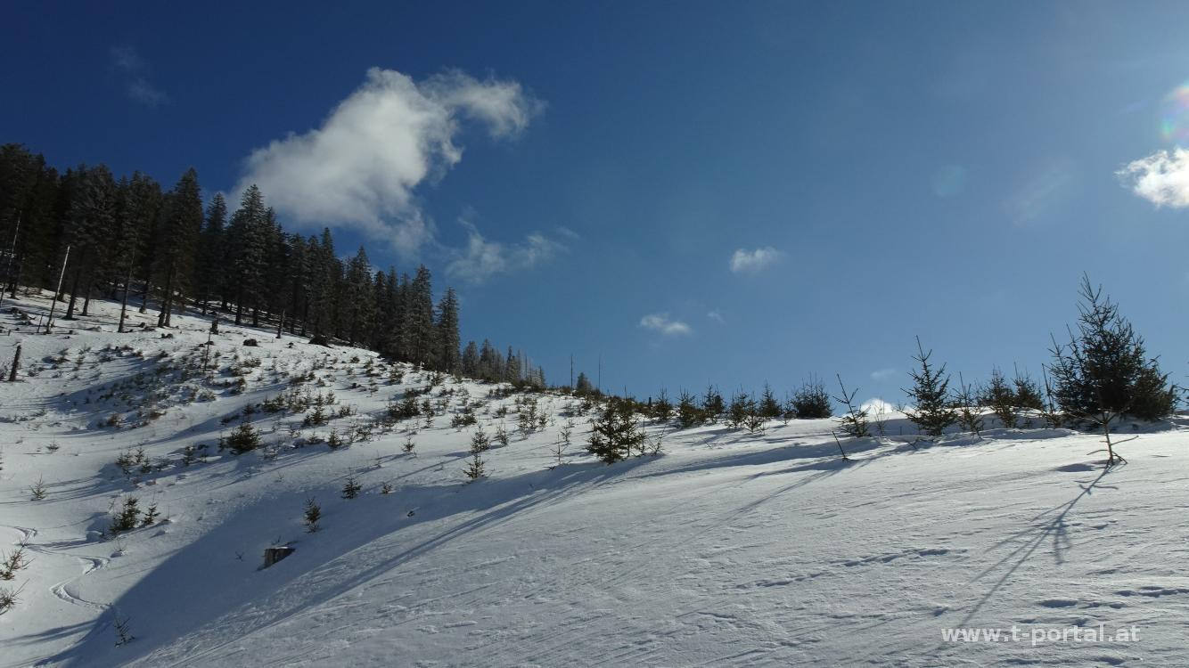 Wir verbringen das Wochenende in der Steiermark und machen zwei Schneeschuhtouren. Die erste Tour startet in Frein an der Mürz. Wir queren die Bundesstraße und folgen nach der Brücke der Forststraße nach rechts hinauf. Es liegt zwar genug Schnee für die Schneeschuhe, nachdem der Untergrund aber eher hart ist, gehen wir mal so los. Anfangs ist es noch bedeckt, in einer der ersten Kurven schaut schon kurz die Sonne heraus. Für uns geht es noch etwas die Straße weiter, bis wir einen gemauerten Bachübergang erreichen. Die Straße führt nach rechts weiter, für uns geht es nun nach links in den Graben. Vorher kommen aber die Schneeschuhe an die Füße. Diesem folgen wir aber nur die ersten Meter und steigen dann nach rechts in den Wald hoch. Hierbei folgen wir zeitweise Ski-Abfahrtsspuren. Anfang geht es etwas steiler hoch, dann gemütlicher etwas nach links auf den Rücken bis zu einer Forststraße. Hier haben wir zum ersten Mal freie Sicht und Ausblick zu den Proleswänden und den Königskogeln. Auf der verschneiten Straße geht es nun etwas nach links weiter und dann nach rechts über Hangquerung mit schrägem Schnee. Weiter vorne biegt die Straße nach rechts ab und würde bald in den Schatten führen. Wir verlassen die Straße und steigen geradeaus rechts neben einem Graben auf. Anfangs etwas steil und durch den tiefen Schnee herausfordernd wird es bald einfacher, dafür etwas schräg. Wir verlassen den Graben nach rechts oben und peilen die nächste Straße an.