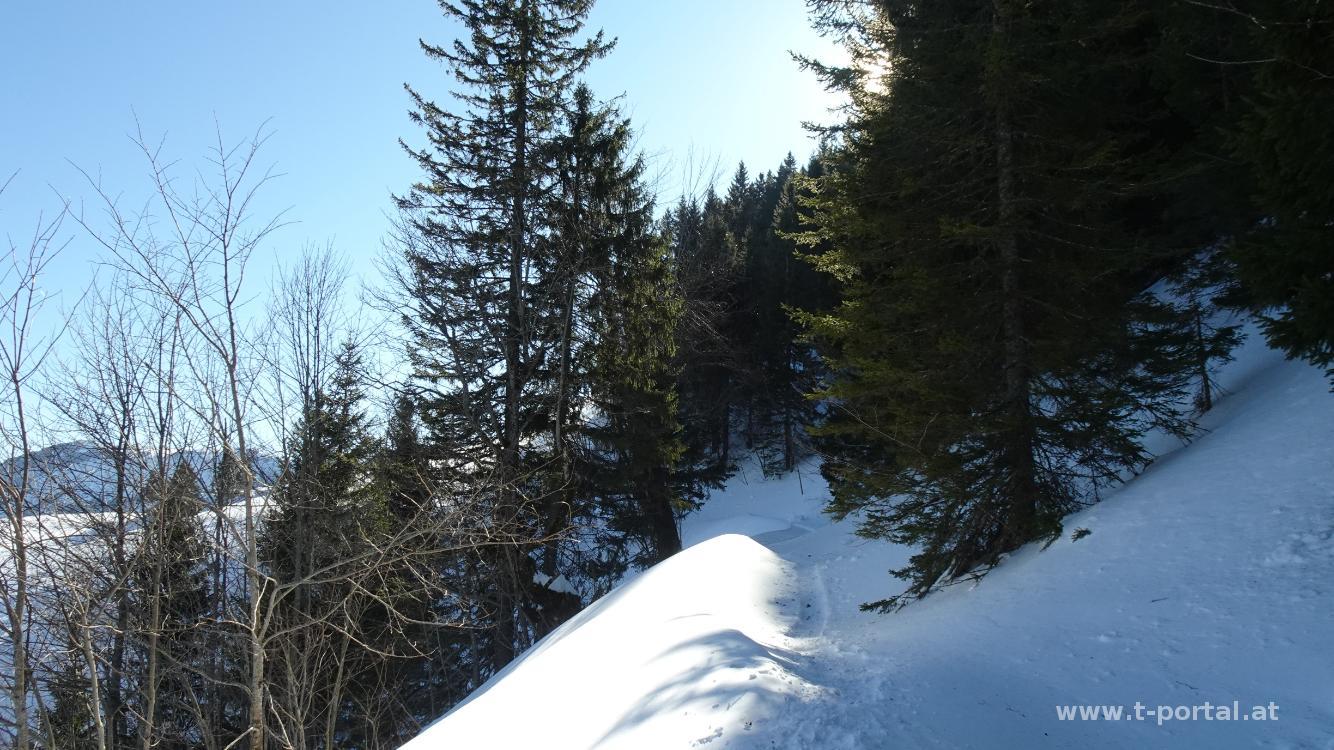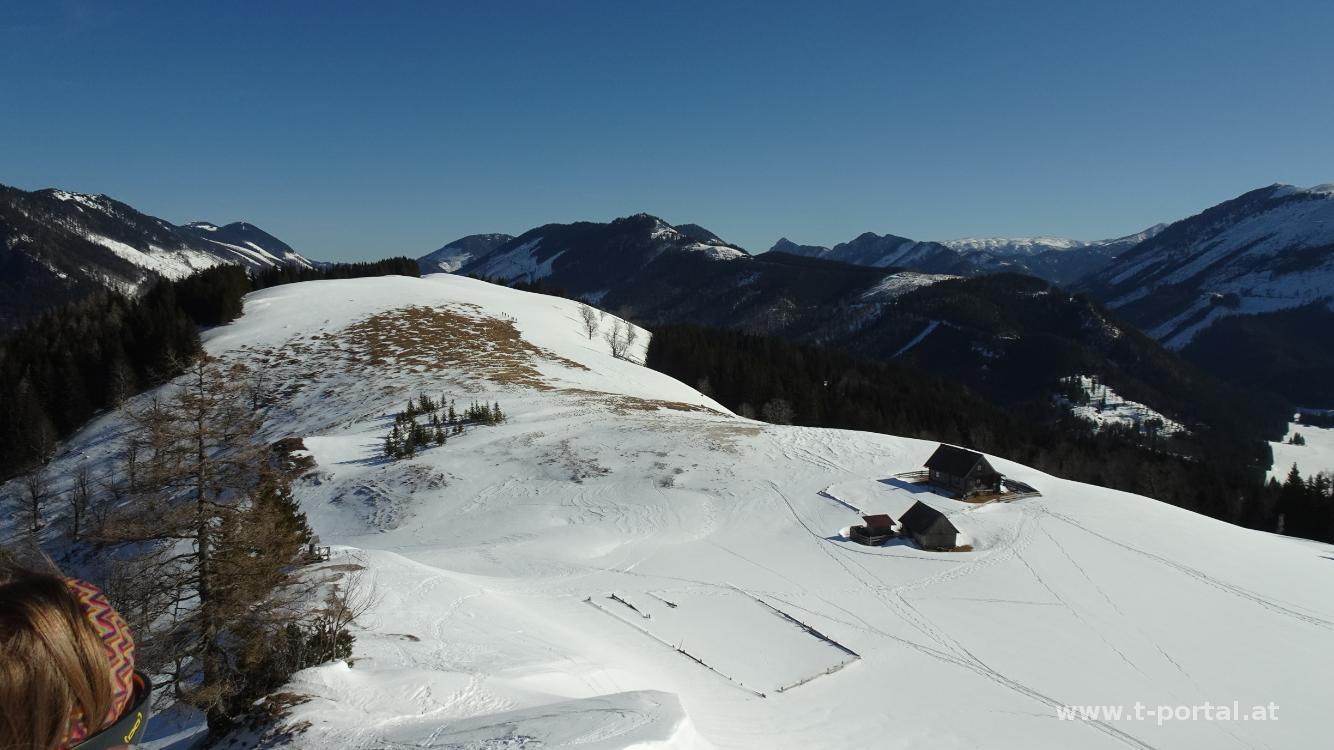 Wir blicken einmal rundum und suchen uns dann einen windgeschützten Platz für die Mittagspause. Anschließend geht es am gleichen Weg retour. Bevor wir jedoch den Abstieg zur Wildalmhütte in Angriff nehmen, biegen wir nach links über den verschneiten Hang ab. Wir folgen ein paar Skispuren, die in den Wald führen. Wir queren diesen nach links und rutschen dann flott über einen freien Hang zurück zur Aufstiegsspur. Auf dieser geht es nun zurück zum Ausgangspunkt.