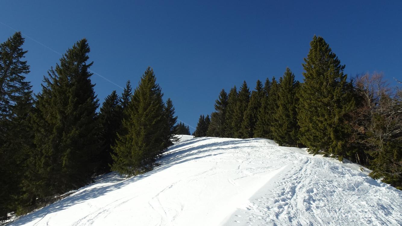 Nach dem Überschreiten der Schattengrenze geht es nun rechts hinauf. Zahlreiche Auf- und Abfahrtsspuren weisen den Weg. Nach einigem Anstieg wird es wieder flacher. Unterhalb der Bäume geht es im Windschatten über die vorhandenen Spuren. Nach leichtem Abstieg geht es neben einer Grube nochmals steiler bergauf. Anschließend weiter bis und vorbei an ein paar Hütten. Nachdem wir unter ein paar Bäumen durchgewandert sind erreichen wir wieder freie Fläche mit Blick zu den Sendern der Wildalpe. Es folgt nochmal ein kurzer Abstieg und erneuter Anstieg. Anschließend noch ein Stück voraus, bis wir an den Sendern vorbei zum Gipfelkreuz gelangen. Die letzten Meter sind so abgeblasen, dass wir die Schneeschuhe abschnallen.