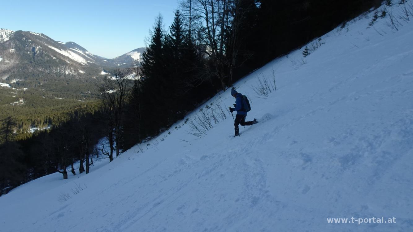 Die zweite Tour an diesem Wochenende führt uns auf die Wildalpe. Wir starten auf der gut beparkten Passhöhe am Lahnsattel und marschieren von dort in den Wald. Die Schneeschuhe schnallen wir gleich an, da es genug Unterlage gibt. Auf einer Forststraße geht es nun zuerst flach dahin. Nach einer Rechtskurve zweigt der Wanderpfad nach links hinauf in den Wald. Diesen queren wir nun und erreichen auf der anderen Seite wieder eine sonnige Forststraße. Kurz geht es auf dieser geradeaus, bis die Spuren etwas nach links in den Wald abzweigen. Wir kürzen somit die Straße etwas ab, um nach etwas kreuz und quer wieder auf dieser zu landen. Nun geht es gemütlich im Schatten bergan. Bald wird links von uns der Blick auf den Göller frei. Nach weiterem Anstieg leiten uns die Spuren rechts hinauf in den Hang oberhalb der Wildalmhütte.