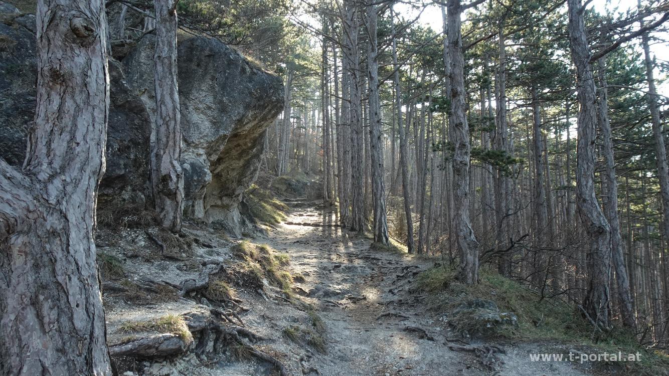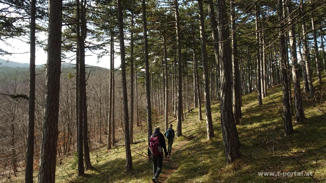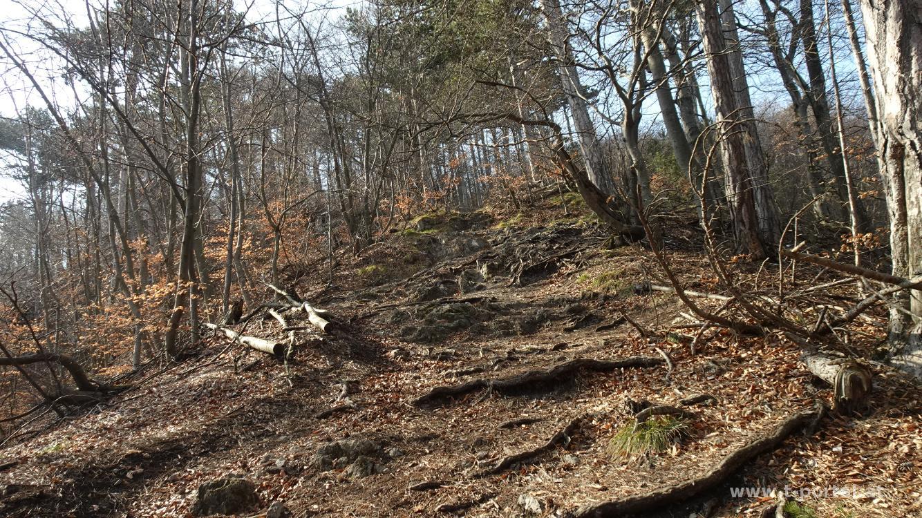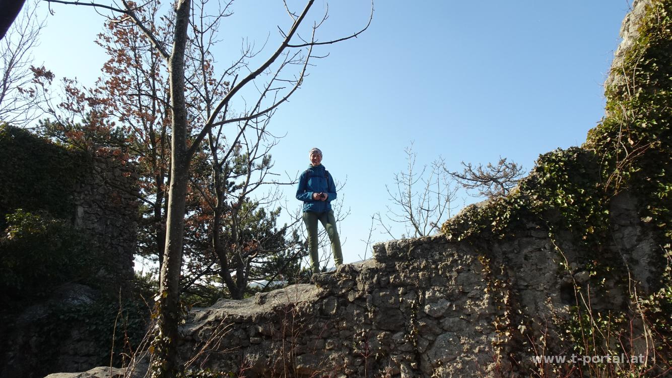 Unser heutige Tour führt uns mit dem Zug nach Baden. Von dort wandern wir durch den Ort und die Parks immer in der Nähe der Schwechat Richtung Westen. In der Nähe des Weilburgparks geht es unter der Bundesstraße durch und ab in den Wald. Über einen Forstweg erreichen wir die Ruine Rauheneck. Nach Besichtung des Turms mit Rundumblick geht es ein Stück Richtung Süden weiter. Wir folgen dne Wegweisern nach rechts zur Königshöhle. Anschließend ein Stück in einen Graben hinab und auf der anderen Seite wieder hinauf. Nun zeigen die Wegweiser immer Richtung Jägerhaus. Nach weiterem Anstieg auf Waldwegen legen wir eine kurze Pause ein. Anschließend nördlich am Jägerhaus vorbei und auf einem teils unmarkierten Steig aufwärts. Auf der schattigen Nordseite gibt es neben dem Weg etwas Schnee. Kurz wird es etwas steiler, beim nächsten Wegweiser geht es nach links und auf den hinteren Lindkogel. Hier legen wir unsere Mittagspause ein. Die Sicht ist heute etwas getrübt, am Unterberg sieht man noch etwas Schnee.