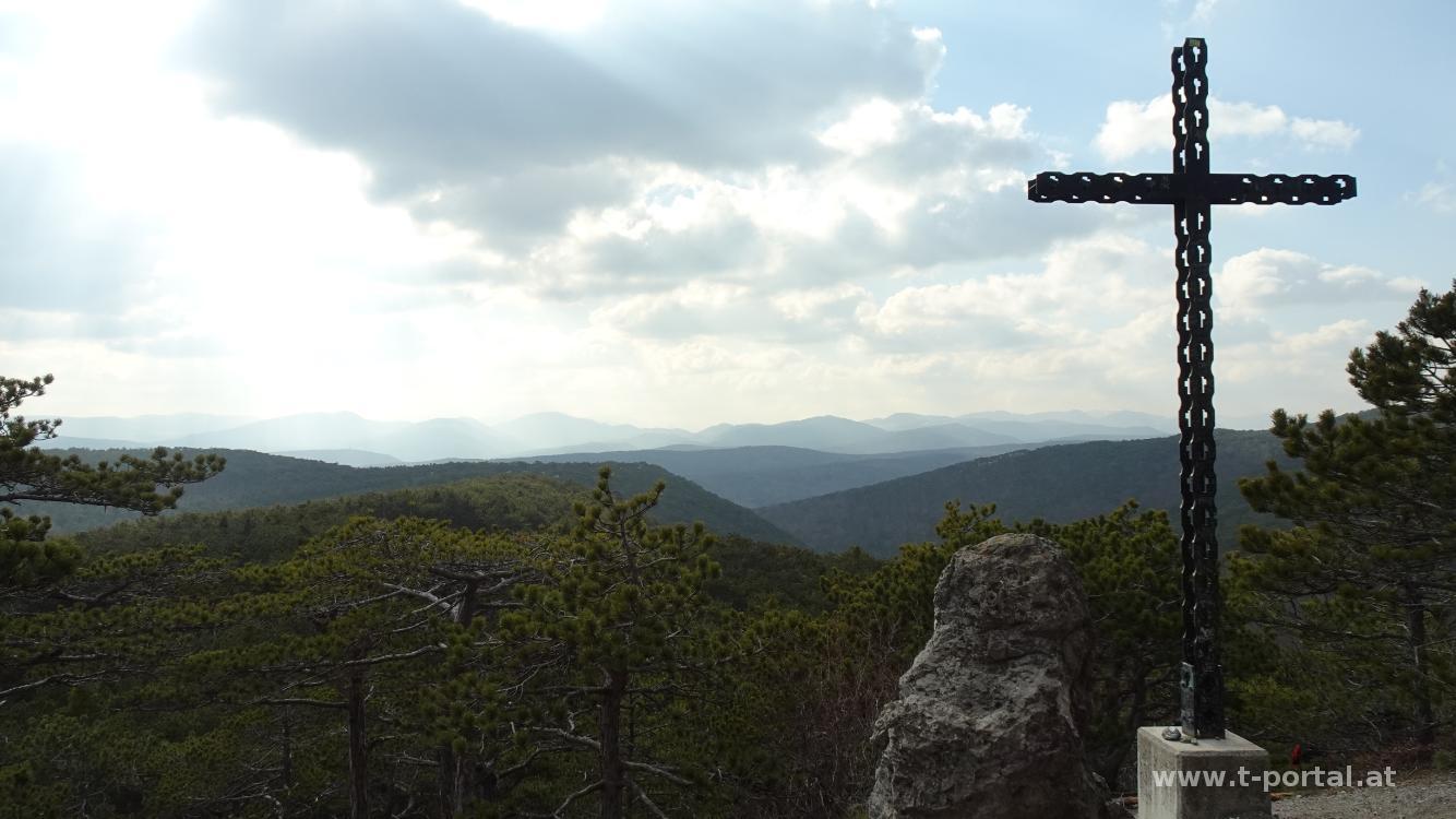 Nach der Rastpause geht es weiter zum Sooßer Lindkogel. Anschließend auf der anderen Seite wieder hinab, nach rechts und wieder nhac links und weiter hinab. Kurz vor der Vöslauer Hütte machen wir einen Abstecher zum Jubiläumskreuz. Die Hütte hat heute noch geschlossen, darum blicken wir uns hier nur kurz um und schlagen dann den Weg Richtung Harzberg ein.