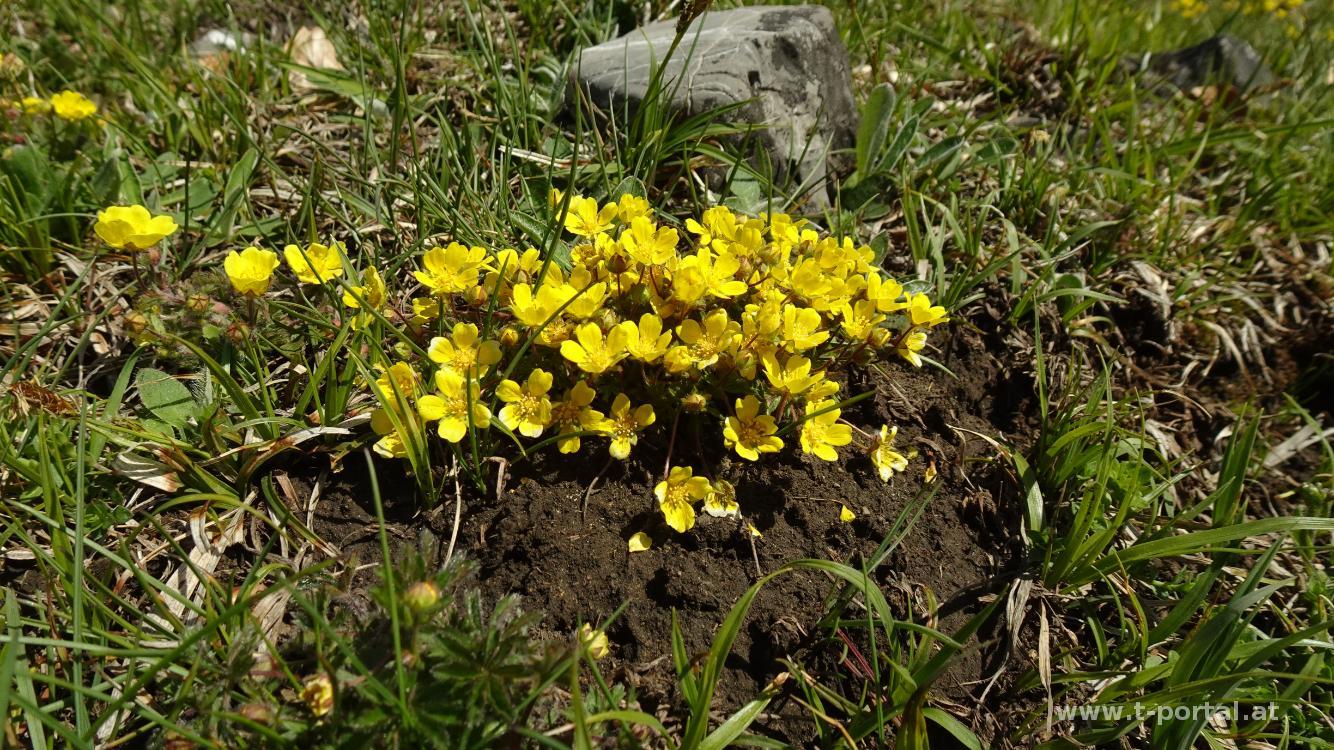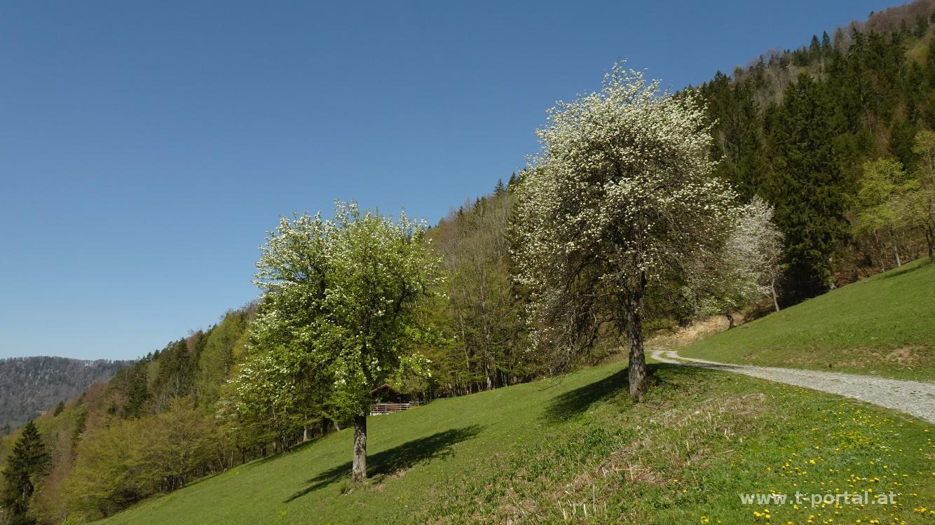 Unser heutige Tour starten wir in Innerfahrafeld. Von dort wandern wir ein Stück das Dürntal hinein bis wir nach dem Thalerhof nach links auf eine Forststraße abbiegen. Diesen folgen wir nun einige Zeit und um einige Kehren. Neben der Straße blühen Blumen und Bäume, somit ist es nicht ganz so eintönig. Weiter oben biegen wir dann auf einen mit Steinmännern markierten Pfad ab, der etwas unterhalb der Straße weiter hinauf führt. Es geht um eine Kurve und nach einem Gedenkkreuz queren wir die Straße. Nun weiter aufwärts, bis wir auf einem Wiesenweg die T(h)alerhütte erreichen. Vorbei an blauen, gelben und violetten Blumen geht es über die Wiese weiter und dann erneut auf die Straße. Diese folgen wir um eine Kehre und knapp danach biegt ein schmalerer Weg nach links hinauf. So kommen wir hinauf zu den Wiesen, die uns Richtung Traisner Hinteralm führen. Unterwegs legen wir in der Sonne noch einen längern Jausen und Raststopp ein.