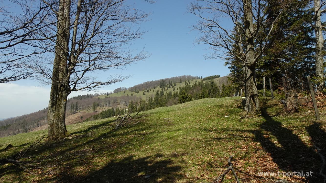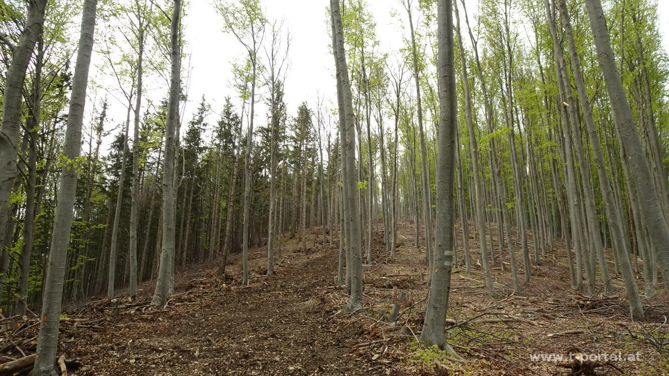 Nach der Lilienfelder Hütte geht es am Jägersteig weiter hinab. Auf der Straße gibt es auch noch einige Forstarbeitsspuren, anschließend geht es überraschend trocken hinab zur Glatzwiese. Nachdem unser Endpunkt der Bahnhof in Lilienfeld sein soll, entscheiden wir uns noch für eine Überschreitung des Spitzbrandkogels. Nach den ersten Minuten über die Wiese sehen wir auch die nächsten Harvester-Spuren, die vom Wanderweg nicht viel übrig gelassen haben. Diese ziehen sich hinauf bis zum Gipfel. Auf der anderen Seite geht es wesentlich angenehmer wieder hinab. Bei der nächsten Wegkreuzung wandern wir in Richtung Richter Ruhe und Lilienfeld. Auch hier stoßen wir im weiteren Abstieg auf einen von Waldarbeiten zerstörten Wanderweg. Über eine Wiese geht es hinab zur Chineser Aussichtswarte, unter dieser hindurch und durch den Stifts- (oder derzeit eher Bärlauchpark) zurück nach Lilienfeld.