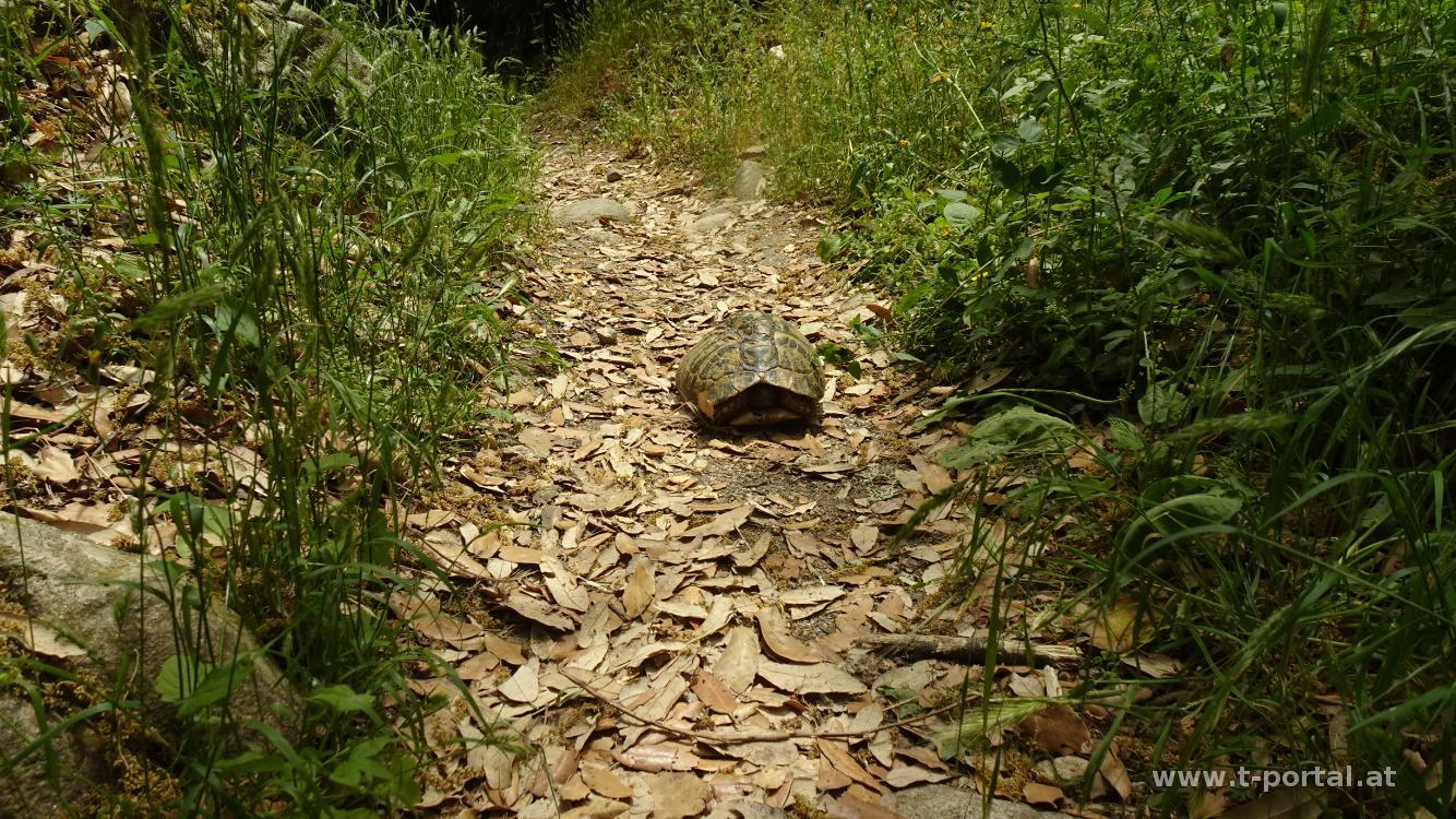 Zwischendurch legen wir eine Rastpause ein und gehen dann am Aufstiegsweg zurück nach Levie. Hierbei treffen wir noch auf eine Landschildkröte.