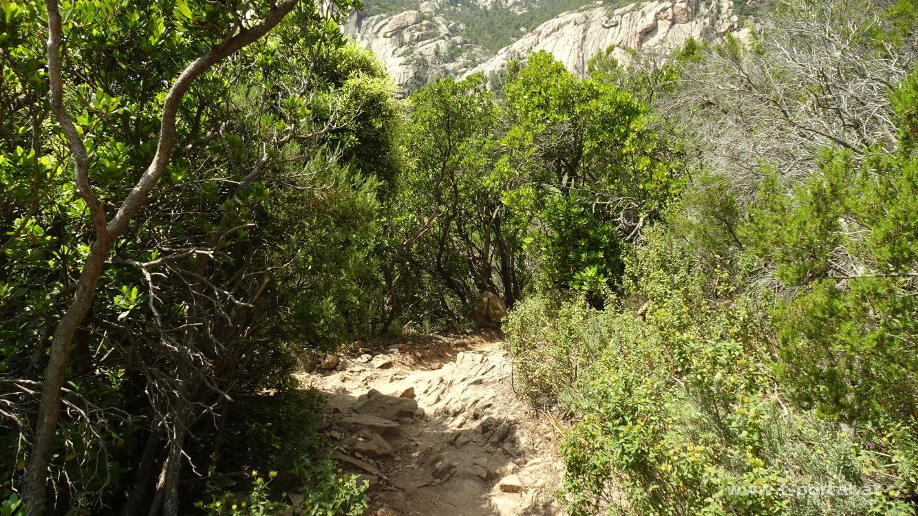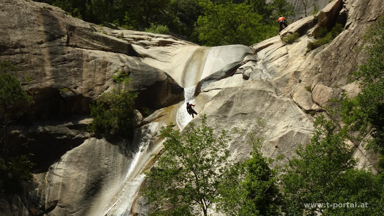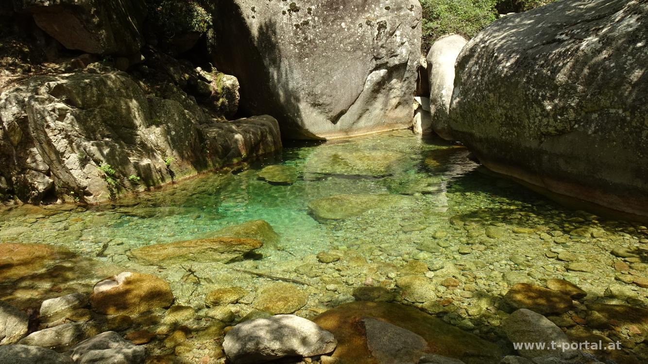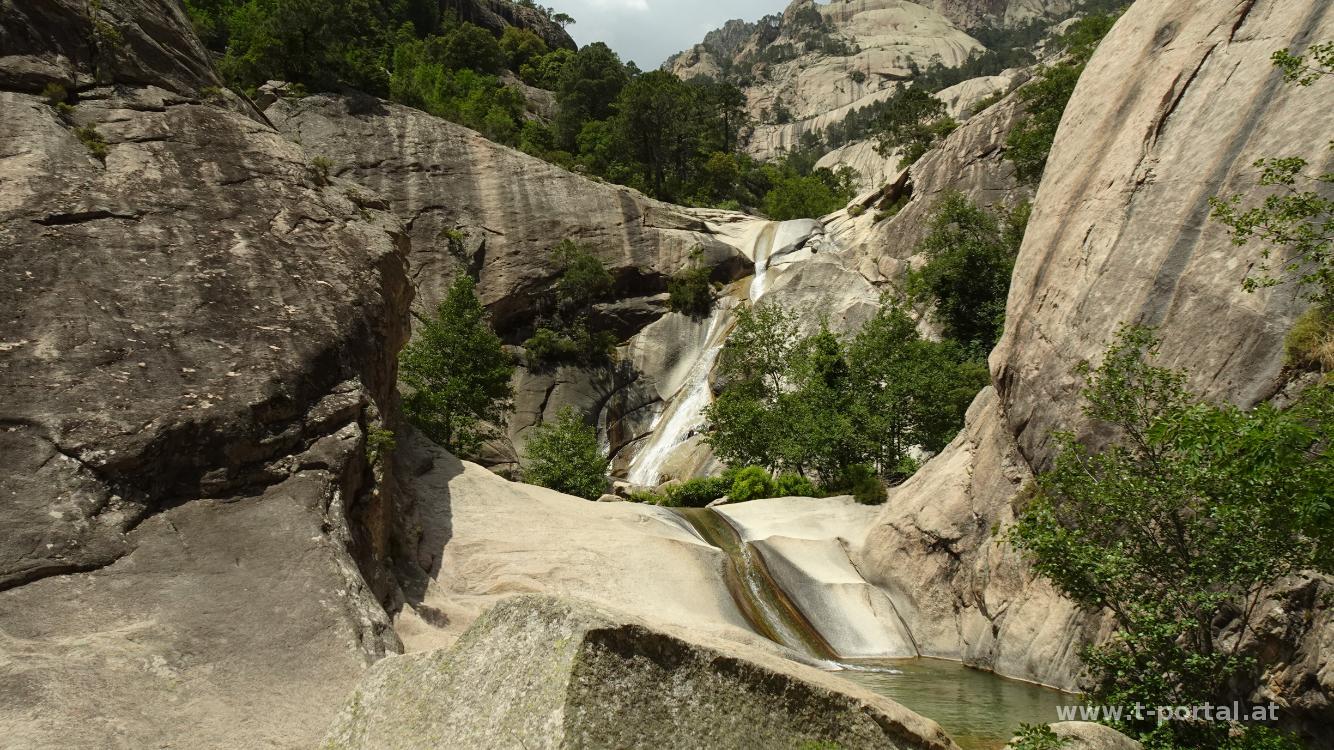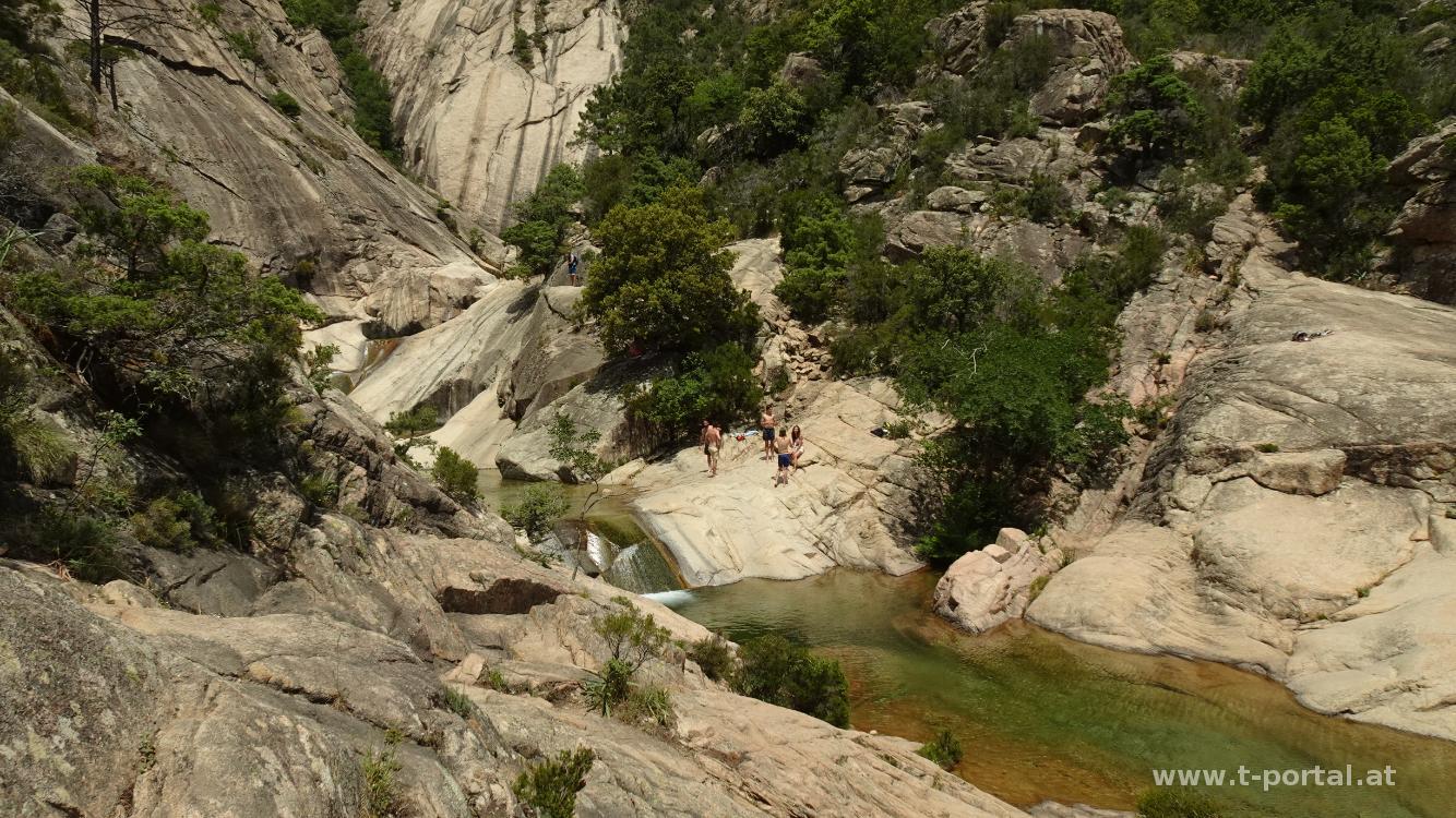 Heute geht es zur Abkühlung nicht ans Meer sondern in den Bergbach. Wir parken am Bocca di Larone und gehen von dort ein Stück die Straße hinab. Bei der ersten Kurve führt geradeaus ein Weg in den Wald. Über Waldboden und Gestein geht es nun um ein paar Felsen und dann nach Norden. Hierbei wird das Rauschen des Purcaraccia immer lauter und ein Stück weiter vorne sehen wir dann auch den Bach. Über einige Felsblöcke geht es noch auf und ab und wir stehen neben dem Bachbett. Über ein paar Steine queren wir dieses und steigen im Wald links davon steil hoch. Felsplatten führen uns nochmal hinab und durch den Bach. Nun auf der rechten Seite hoch und noch ein paar Minuten neben den Kaskaden weiter, bis wir einen Wasserfall mit Steinrutsche und ein Badebecken erreichen.