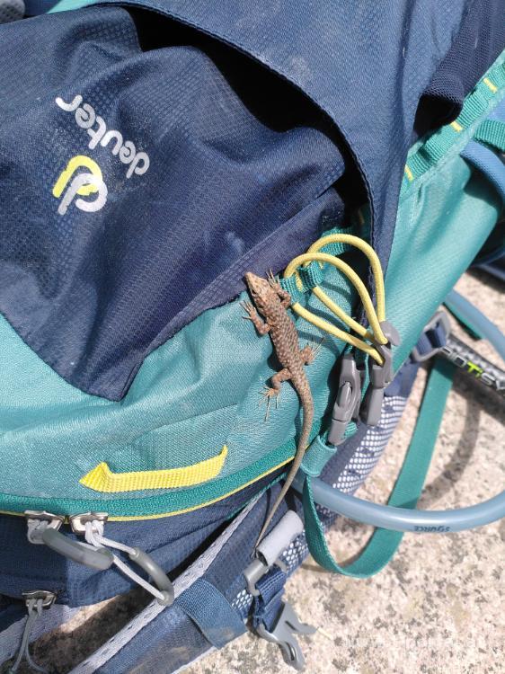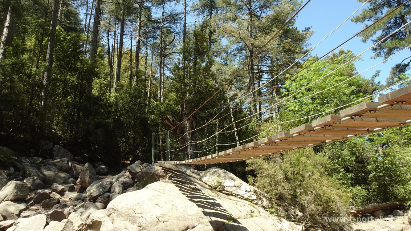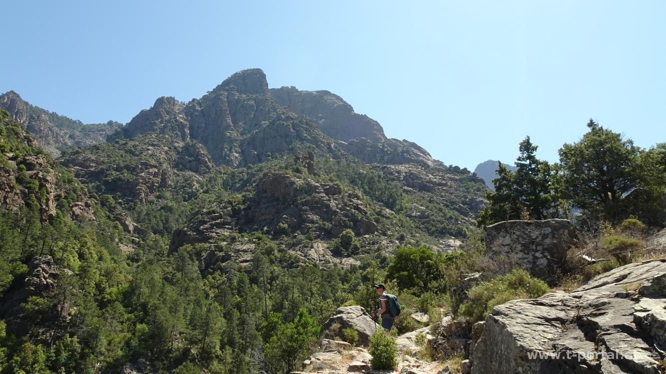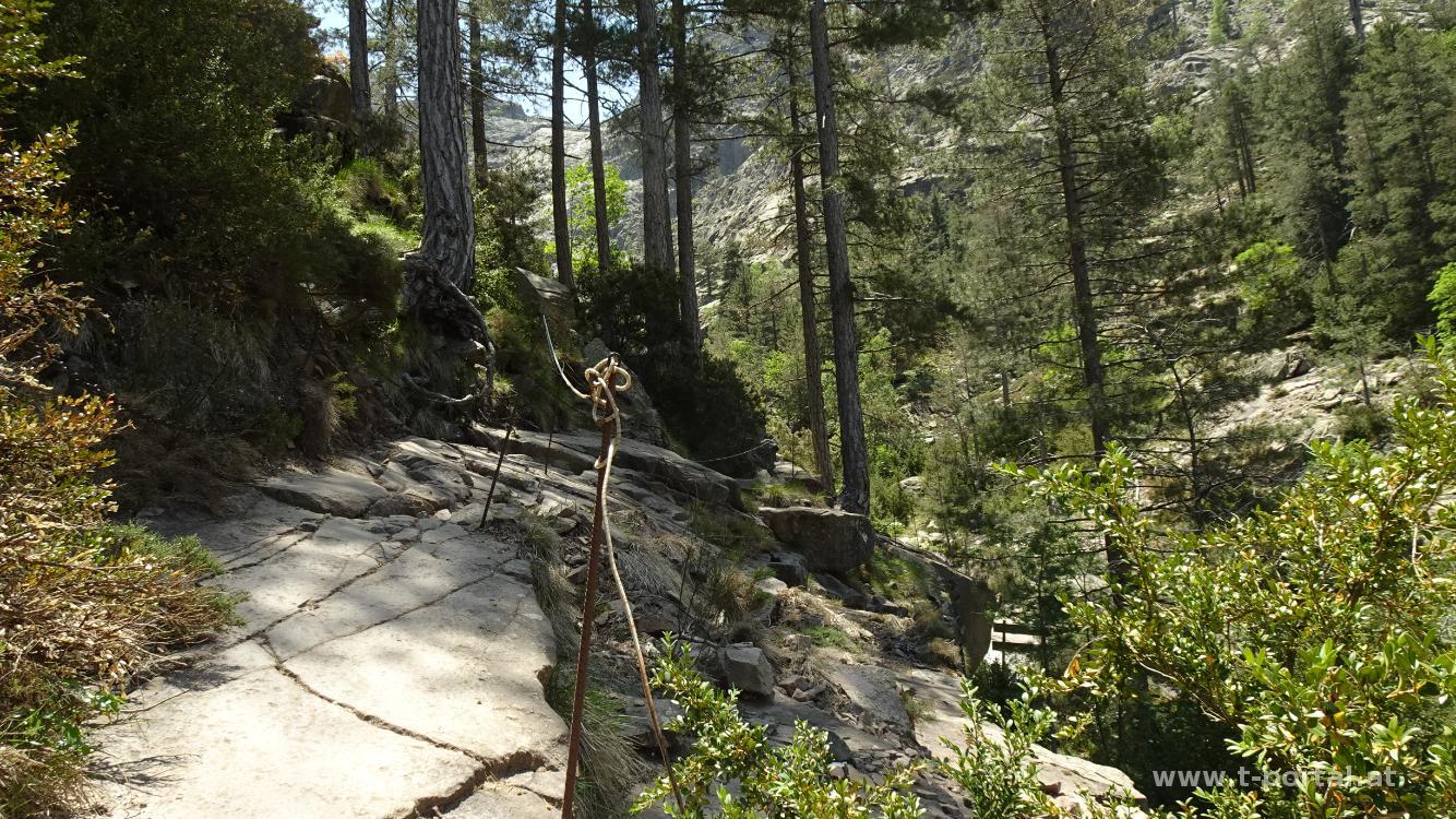 Nach kurzem Rundumblick wanden wir am GR20 weiter nach Süden, steigen entlang von Ketten über ein paar Steinplatten und erreiche nach kurzem Abstieg die Hängebrücke Passerelle de la Spasimata. Neben der Brücke gibt es einen schönen Rastplatz mit recht frischem Wasserloch und frechen Eidechsen.