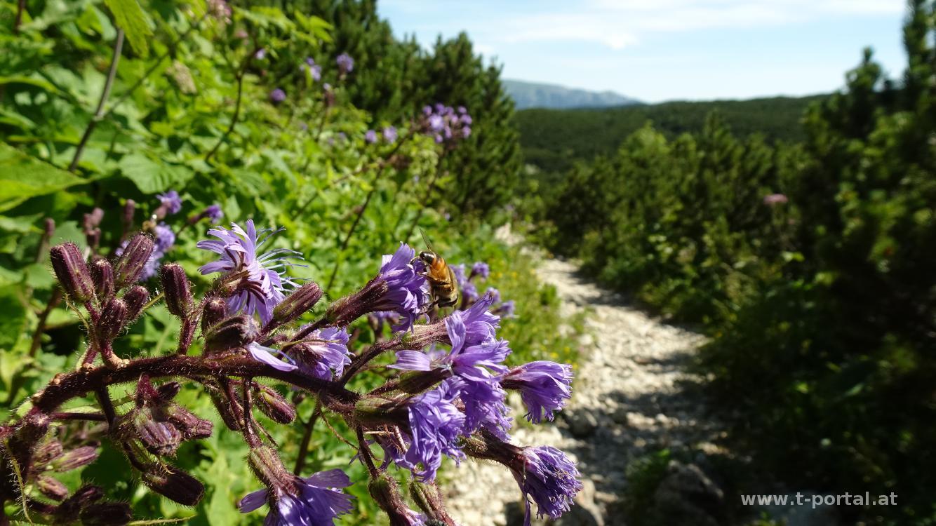Anschließend geht es an einigen Edelweiß vorbei, einmal auf, einmal ab, durch die Latschen, über Schotter und schlussendlich hinab zum Ottohaus. Hier kehren wir zum ersten Mal in unserem Leben ein und stärken uns mit Jausenbrot. Anschließend geht es hinab zum Törl und am Törlweg weiter Richtung Tal. Die ersten Kehren führen über Schotter, später geht es im Wald weiter abwärts. Je weiter wir hinunter kommen, um so heißer wird es. Beim Lammelbrünnl erfrischen wir uns etwas und gehen dann gemütlicher hinab zum Knappenhof.