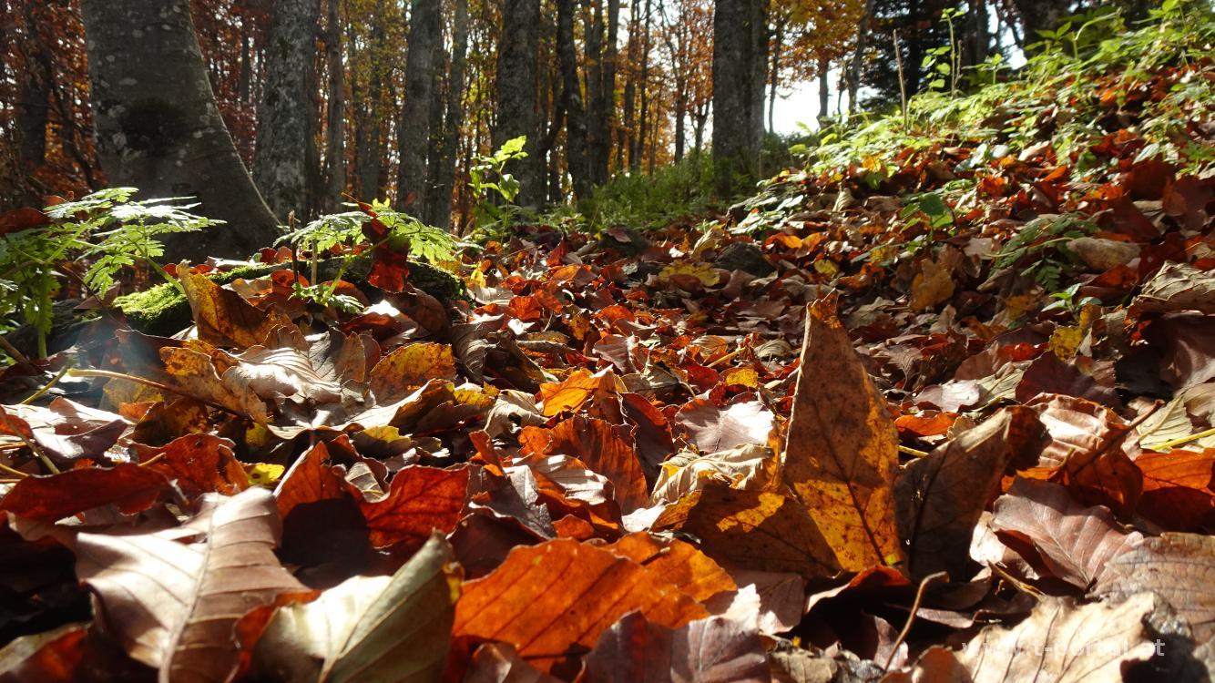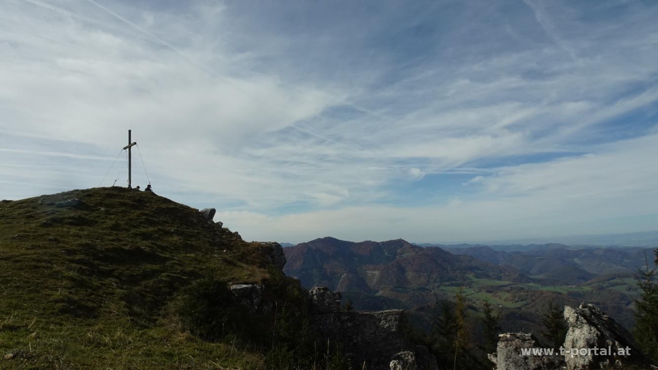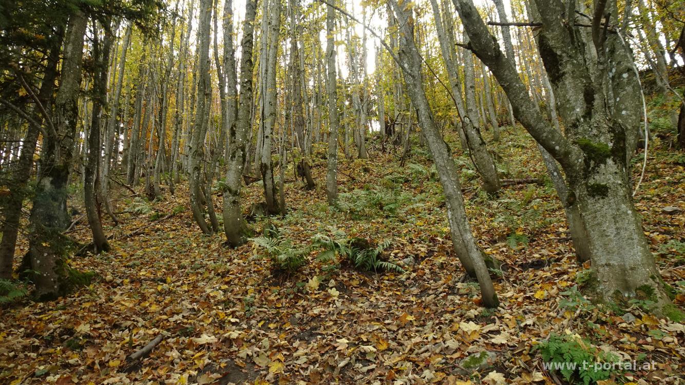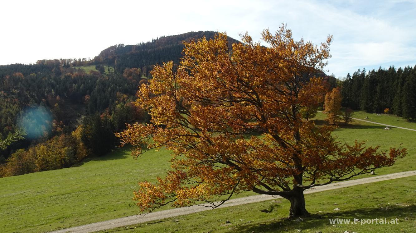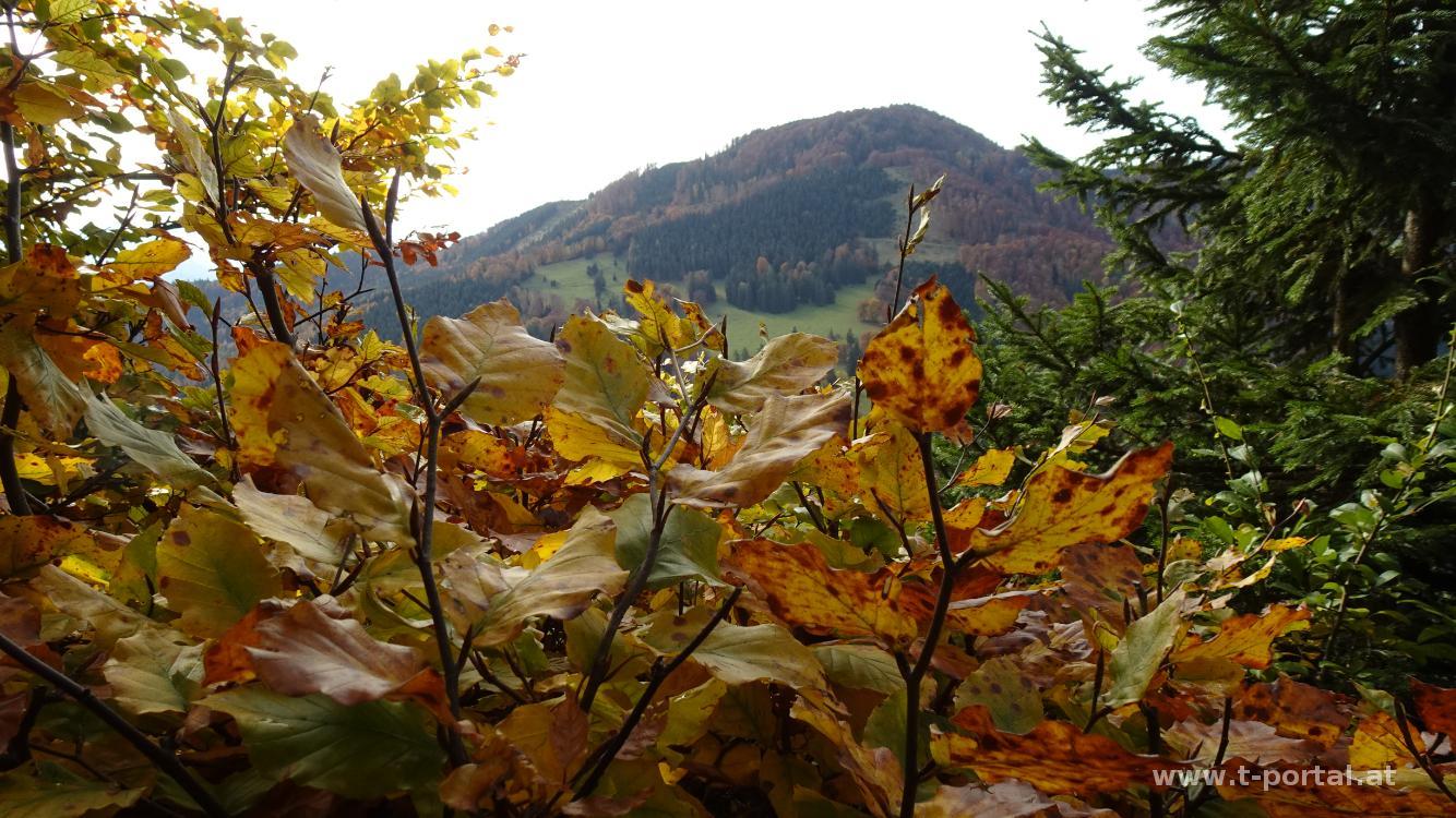 Es herbstelt so schön, da machen wir am Nachmittag eine Wanderung auf das Hochstaff und die Reisalpe. Am Parkplatz ist gut was los, wir biegen jedoch am Weg bald ab nach links und unmarkiert zum Hochstaff. Wir queren das Gatter und wandern über die Wiese zum Waldrand. Nun am gar nicht so feuchten Pfad im Wald aufwärts. Nach Querung der Schotterstraße geht es weiter bergan und über den Zaun. Nun fehlt nicht mehr viel und über das bunte Laub erreichen wir den Gipfel am Hochstaff. Nachdem hier eine Dronen herumsurrt suchen wir uns einen Aussichtsplatz etwas abseits.
