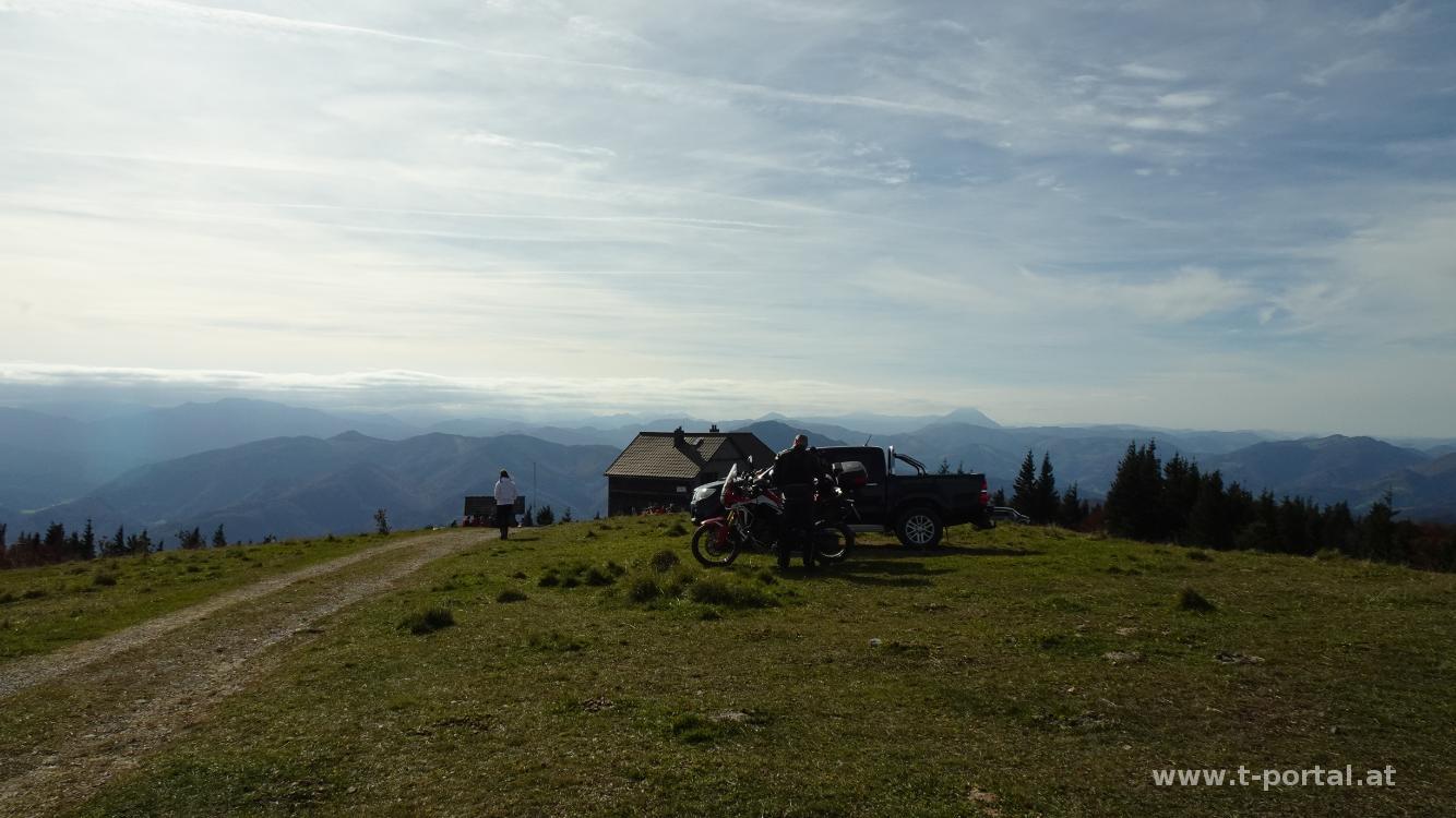 Anschließend geht es auf der anderen Seite hinab zur Kleinzeller Hinteralm. Wie vermutet, ist diese bereits geschlossen, somit geht es über die Wiese und den Wald wieder aufwärts. Das Bäume sind bunt, der Boden etwas nass, alles wie erwartet. Nach einigem Anstieg erreichen wir die Wiese vom Gipfelkreuz und sind ob der vielen Autos, die heute neben dem Gipfelkreuz parken erstaunt. Wir fragen den nächstbesten Motorradfahrer, der uns erzählt das hier heute Bergmesse ist und man mit dem Auto (oder Motorrad) bis nach oben fahren darf.