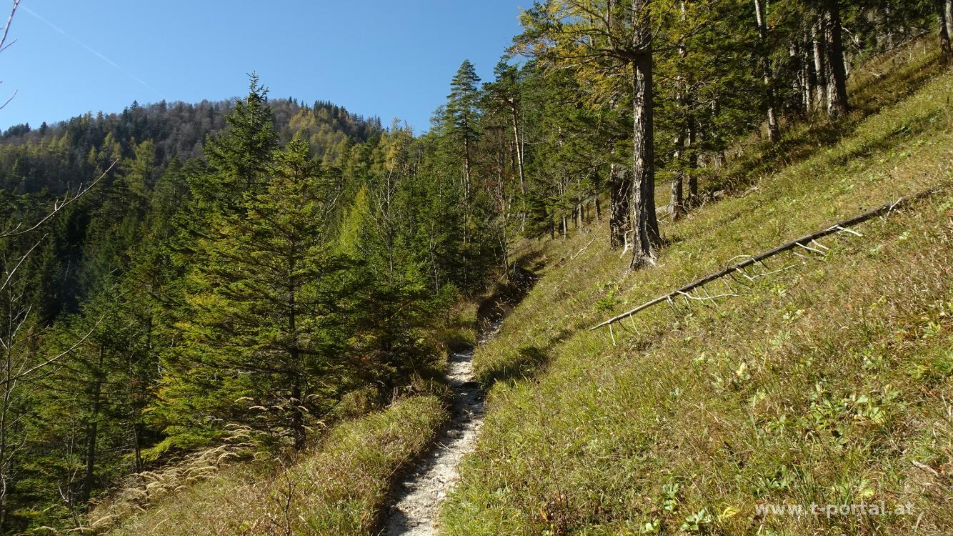 Die Hütte ist heute geschlossen und es ist auch gerade nix los. Wir schauen kurz in die Gend und wandern dann hinter der Hütte vorbei, kurz durch Wald hinab und dann wieder aufwärts zu den Gipfeln. Es geht über Wiesen und durch Wald, bis wir die Latschenzone erreichen und weiter der Sonne entgegen gehen. Es folgt etwas feuchtes Erdreich, bis wwir zum Abzweiger zum kleinen Göller kommen, den wir in wenigen Minuten erklimmen.