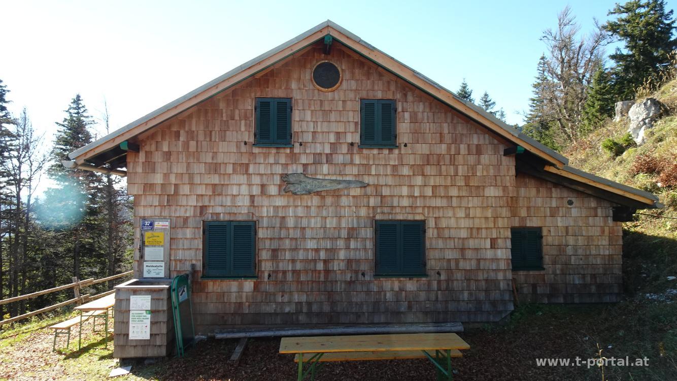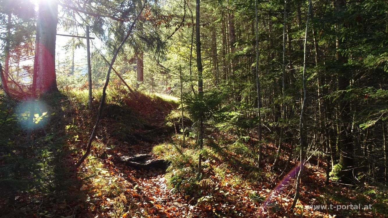 Letzte Woche sah es uns am Göller nach Wolken aus, darum sind wir schon vorher zu Hochstaff und Reisalpe abgebogen. Heute sieht es besser aus und so fahren wir bis nach Kernhof. Wir parken in der Nähe der Feuerwehr und folgen von dort der Asphaltstraße Richtung Trenk-Wasserfall. Bald biegen wir auf einen Schotterpfad und später in den Wald ab und gelangen so über den laubbedeckten Pfad zum Wasserfall. Nachdem wir uns etwas umgeblickt haben und die Pferdewanderer vorbeigezogen sind wandern wir ein Stück zurück und folgen den Wegweisern nach rechts zu Waldhüttsattel und Göller. Am Waldpfad geht es nun über Laub und bei recht warmen Temperaturen immer aufwärts. Wir erreichen den Gippelblick und nach weiterem Ansteig die Kreuzung beim Waldhüttsattel. Über die Forststraße wandern bis zur Wiese unterhalb der Göllerhütte, quer über diese drüber folgt schon bald der Anstieg zur Hütte.