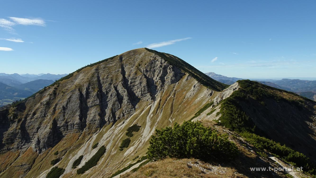 Von hier oben schauen wir schon zum Kamm zum großen Göller. Nach Rückweg zum Normalweg beginnt bald der letzte Anstieg auf den großen Göller. Nach dem Weg über die Felsen geht es am Gipfelplateau nur noch ein Stück flach dahin und schon stehen wir beim großen Gipfelkreuz. Nachdem es oben recht windig ist suchen wir uns einen geschützten Platz zum Jausnen. Anschließend geht es am gleichen Weg wieder zurück.