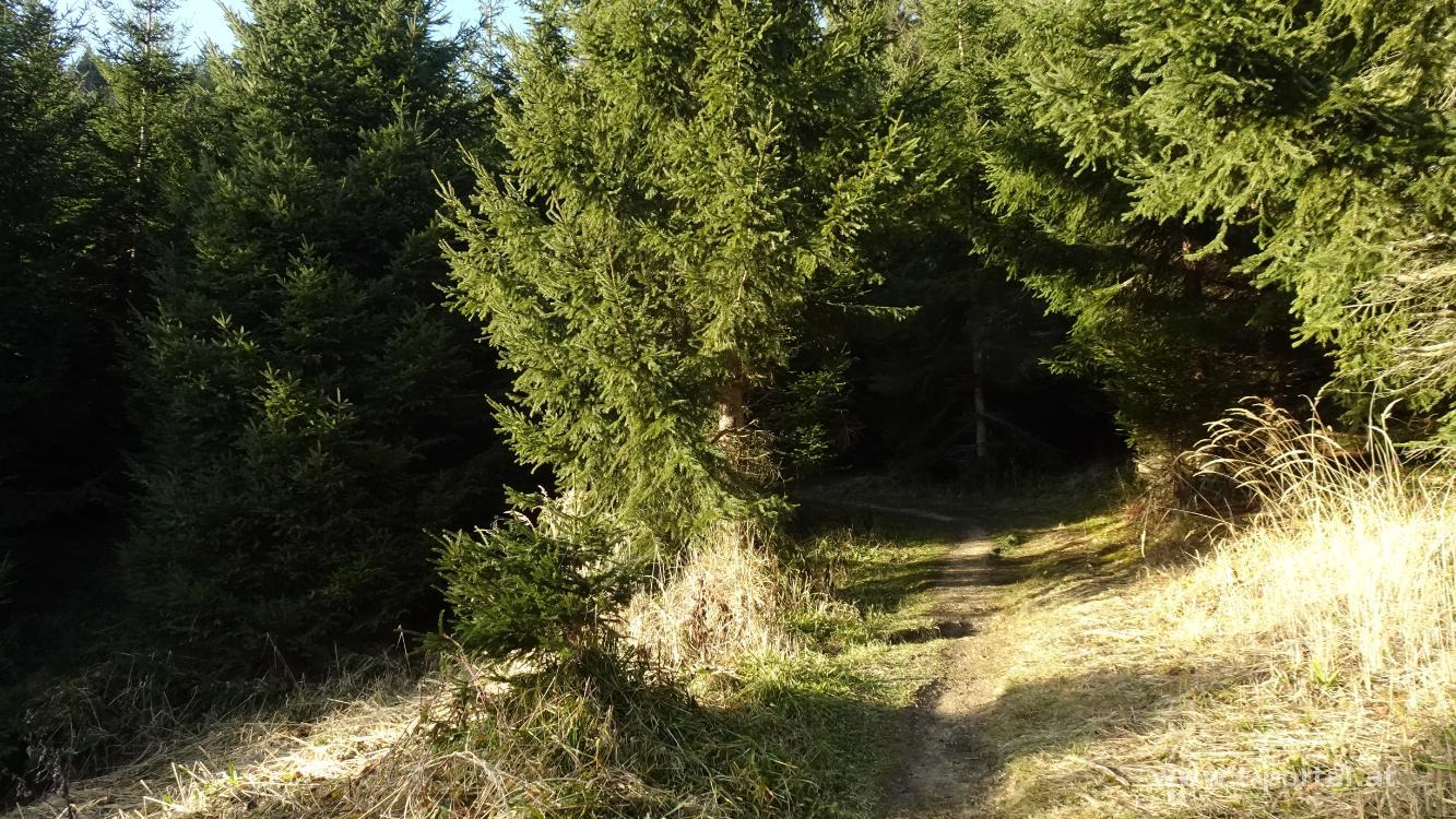 Von der Aussichtsplattform geht es auf einer Forststraße um die nächste Kehre. Über einen Waldweg kürzen wir ein Stück der Straße ab und folgen ihr anschließend nach Norden. Vorbei an einer Jagdhütte geht es etwas auf und ab. Nach einiger Hatscherei gehen wir auf einem schmaleren Waldpfad in Richtung Schöffenbaumer Kapelle. Nachdem hier Forstarbeiten aber auch den Weg zergatscht haben, wenden wir uns schon vorher nach links und steigen so ab nach Oberaschau. Auf Asphalt geht es durchs Dorf, vorbei an den Loipen und zurück zum Skilift.