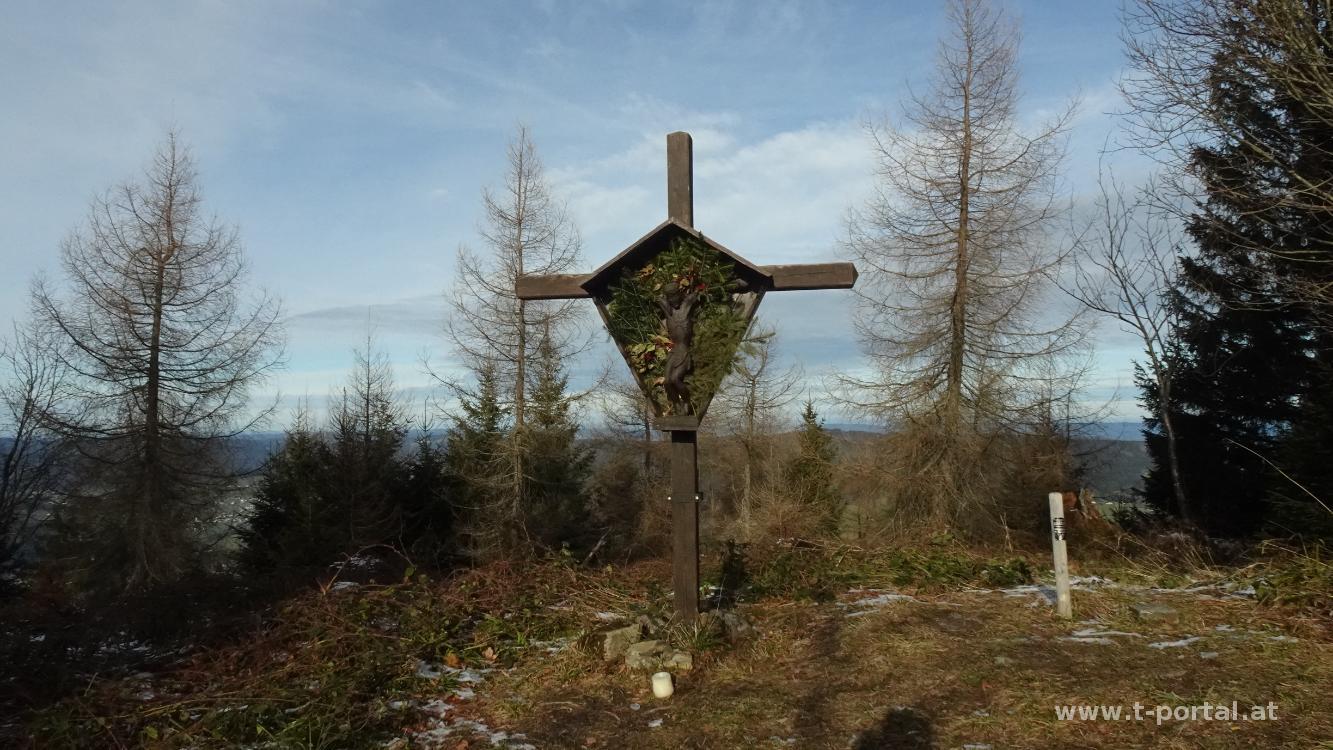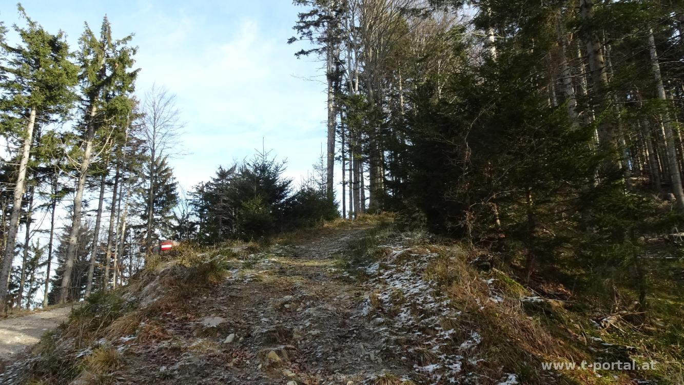 Von der Forststraße geht es noch über einen Hügel und dann hinauf zur Hochplettspitze. Kurz davor gibt es eine ausgeschnittene Aussicht zum Dachstein. Beim Gipfel dann ein Kreuz und ein Rastbankerl. Hier vernichten wir unsere migebrachte Jause und wandern wann auf der anderen Seite wieder hinab. Nun nehmen wir noch den unmarkierten Anstieg zum großen Hollerberg in Angriff, wobei uns Traktorpfade fast bis zum Gipfel führen. Wir folgen von dort einer Schneise westwärts und stoßen auf eine zehn Meter breite Forstautobahn. Wir folgen dieser Lehmgatschstraße um eine Kurve und finden dann den eigentlich gesuchten Weg wieder. Dieser führt uns erneut hinab zu einer Straße. Wir wandern nach Westen weiter und kommen zur Aussichtsplattform Hollerberg. Von hier blicken wir zum Attersee, hinüber ins Höllengebirge, zum Traunstein links davon, rechts davon die Hohe Schrott und dahinter das Tote Gebirge, im Süden folgen Leonsberg, Breitenberg, Dachstein, Gamsfeld und schließlich der Schafberg.