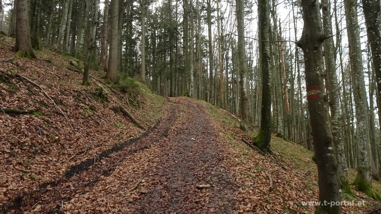 Die heutige Tour führt uns auf die andere Seite des Attersees. Wir starten in Oberaschau. Hier gibt es ein Schigebiet, das jedoch nicht in Betrieb ist, da es selbst hier auf der schattigen Nordseite zu warm ist. Nur am Kinderteppich rutsch jemand herum. Wir wandern neben der grünen Piste auf einer feuchten Forstraße aufwärts und erreichen bald den Waldrand. Die Straße wir davon auch nicht trockener. Abwechselnd geht es nun auf Forststraßen und Waldpfaden aufwärts. Mal feucht, mal nass, mal gatschig und selten wirklich trocken. Nach einigem Anstieg kommen wir zu einer Forststraße, die rund um den Koppenstein führt, wir folgen dieser und treffen ein paar Schneereste und endlich auch mehr Sonne.