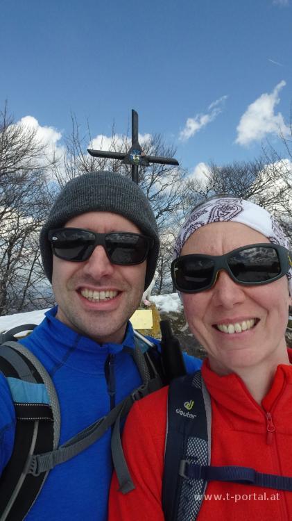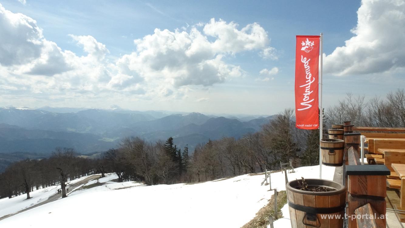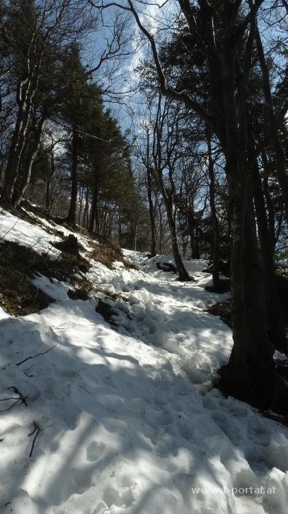 Das schöne Wetter lockt uns zu einer Tour auf den Muckenkogel. Wir starten heute beim Bahnhof in Schrambach und folgen dort dem Leitner Weg hinauf zur Zauner Ruhe. Auf der anderen Seite führt der schöne Weg hinab ins stille Tal. Hier folgen wir der Forststraße hinauf bis zur Glatzwiese, dabei wir uns in der Sonne schon recht warm. Von der Wiese schwenken wir ein in den Jägersteig, der heute weniger fecuht ist als erwartet. Am Wanderpfad und kurzen Forststraßenstücken geht es so hinauf bis zur Lilienfelder Hütte. Wir wandern über die Wiesen weiter hinauf und legen zwischendurch eine Jausenpause in der Sonne ein. Anschließend erreichen wir die Liftstation und wandern auf der Asphaltstraße weiter. Über die Klöstertreppe erfolgt der Anstieg auf den Muckenkogel. Dabei geht es durch Schneereste etwas feucht aufwärts.