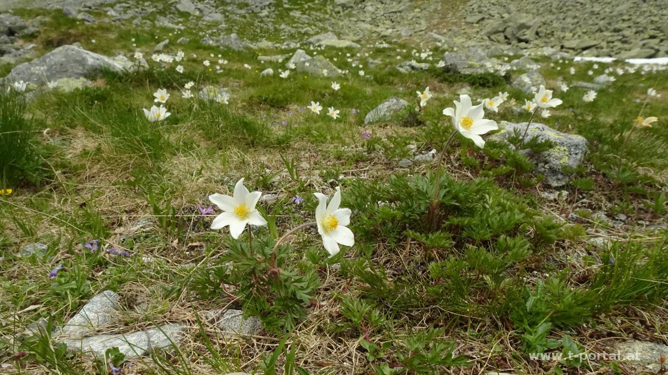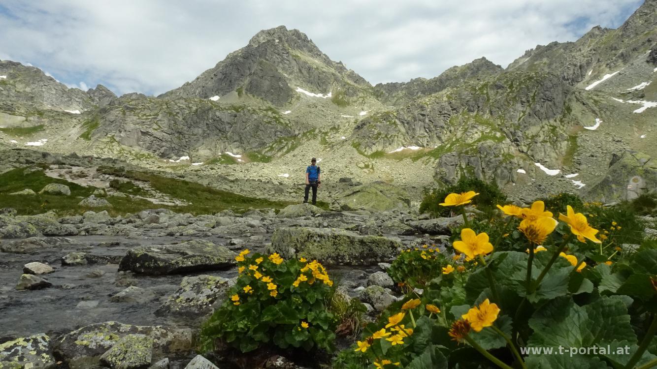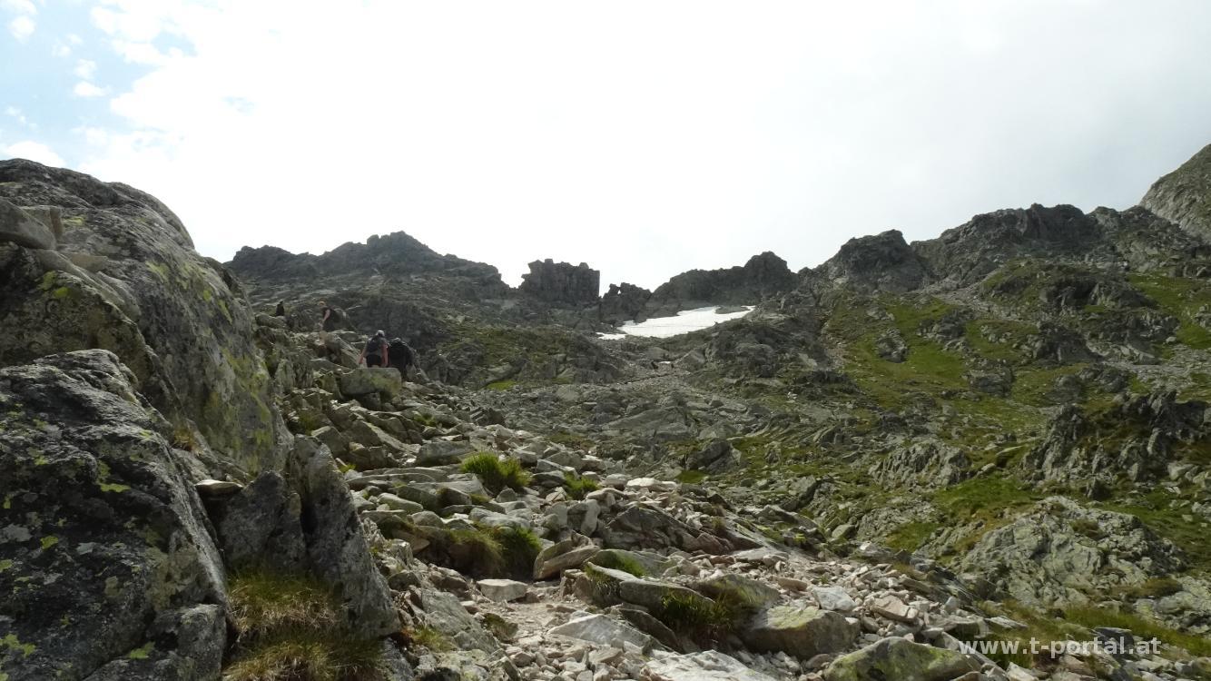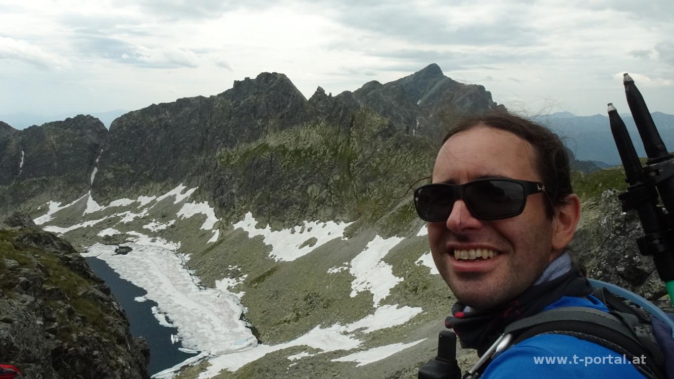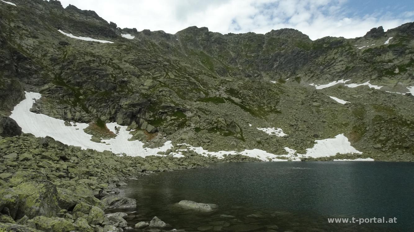 Nach Rastpause am See geht es auf der Westseite vorbei, über ein flaches Schneefeld und dann bald steil hinauf in Richtung Scharte. Nach dem zähen Anstieg geht es nochmal über ein Schneefeld (hätte man wohl auch unten umgehen können). Vor dem letzten Anstieg in die Scharte blicken wir noch etwas in die Gegend, bewundern den Eissee unter uns und die zahlreichen Gipfel der Hohen Tatra. Anschließend klettern wir über Felsen entlang einer Kette hoch in die Scharte und auf der anderen Seite wieder hinab. In einigen Kehren geht es nun hinab, bis wir einige Meter oberhalb des Vyšné Wahlenbergovo Pleso stehen. Klaudia schaut sich den See noch von der Nähe an, dann geht es weiter hinab zum Unteren Wahlenberg See (Nižné Wahlenbergovo Pleso). Durch das Furkotatal (Furkotská dolina) geht es nun hinab. Teilweise ist der Weg wie Stufen angelegt, teilweise wandern wir über Schotter abwärts. Nach kurzer Pause und weiterem Abstieg erreichen wir die Kreuzung, die uns zur Bergstation Seilbahn führen würde.
