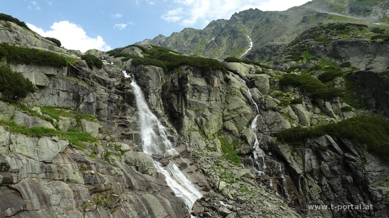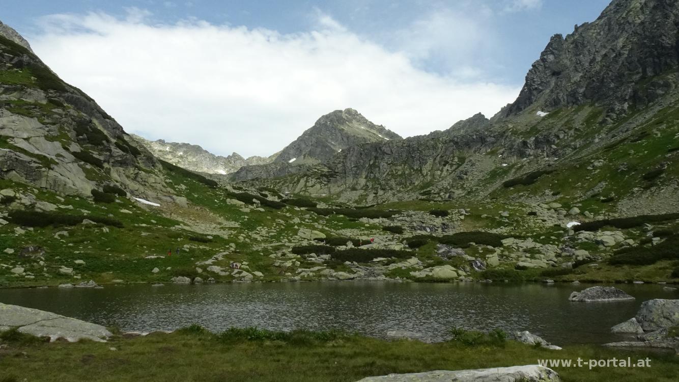 Unser zweite Urlaubstour führt uns in die Hohe Tatra. Wir starten unsere Tour in Štrbské Pleso, wandern vorbei an Hotels und Souvenirständen bis zur Talstation der Seilbahn. Von hier führt ein breiter Schotterweg durch Wald und entlang des Bachs bis zum Wasserfall Vodopád Skok. Links neben den Wasserfall führt der Weg weiter hoch, mit Eisenketten über ein paar Steinplatten und dann hinauf zum See Pleso Nad Skokom. Auf inzwischen schmaleren Wegen sind noch immer erstaunlich viele Leute unterwegs. Viele davon mit halbhohen Schuhen, T-Shirts und kurzen Hosen - und es sieht nicht so aus, als ob sie mehr Ausrüstung im Rucksack hätten. Nach etwas flacherem Anstieg bis zu den Überresten eines Hubschrauberabsturzes geht es rechts steiler hinauf bis zum nächsten See - den Capie Pleso.