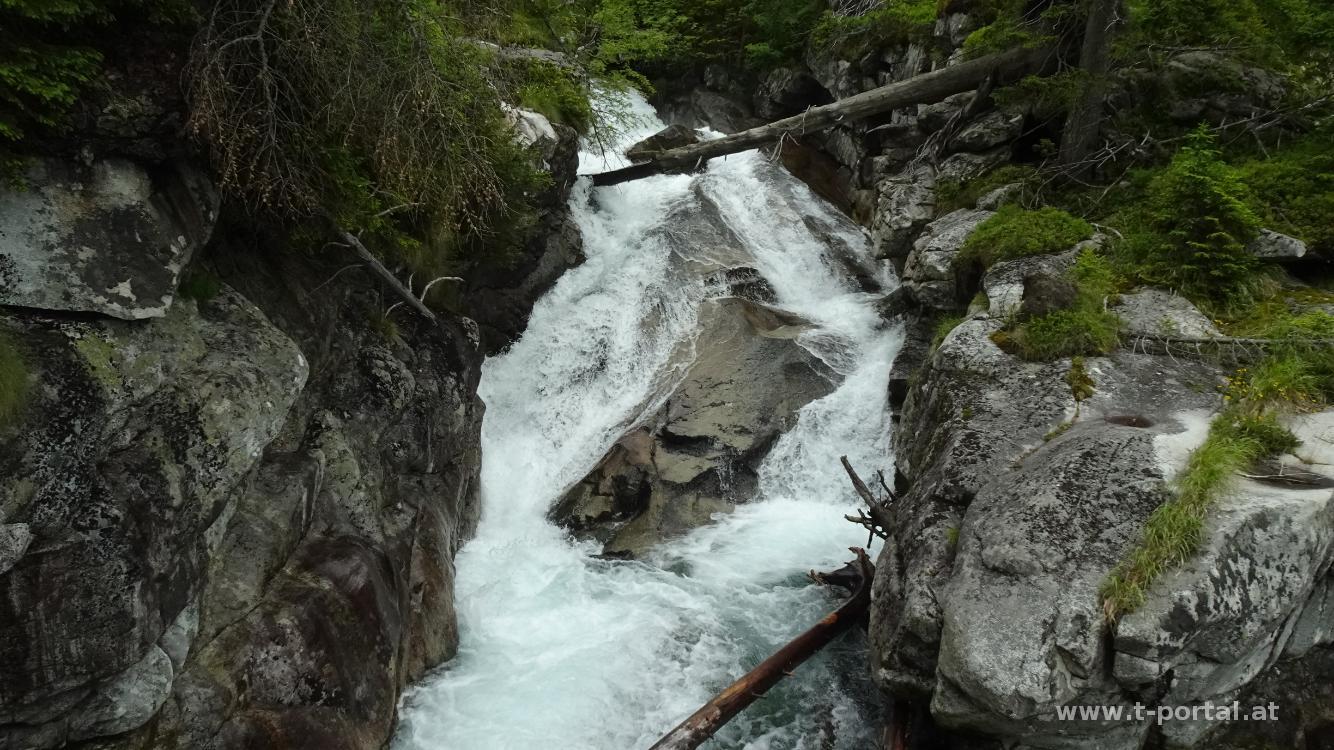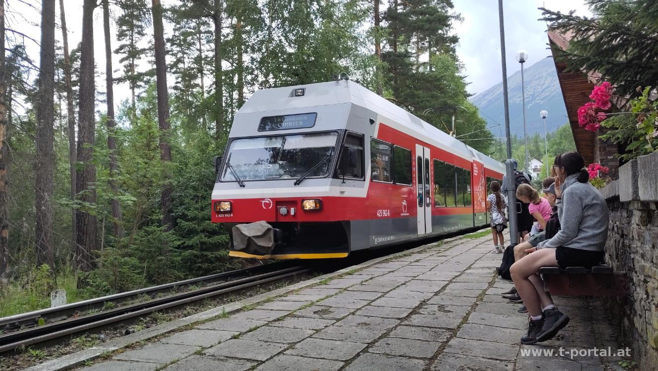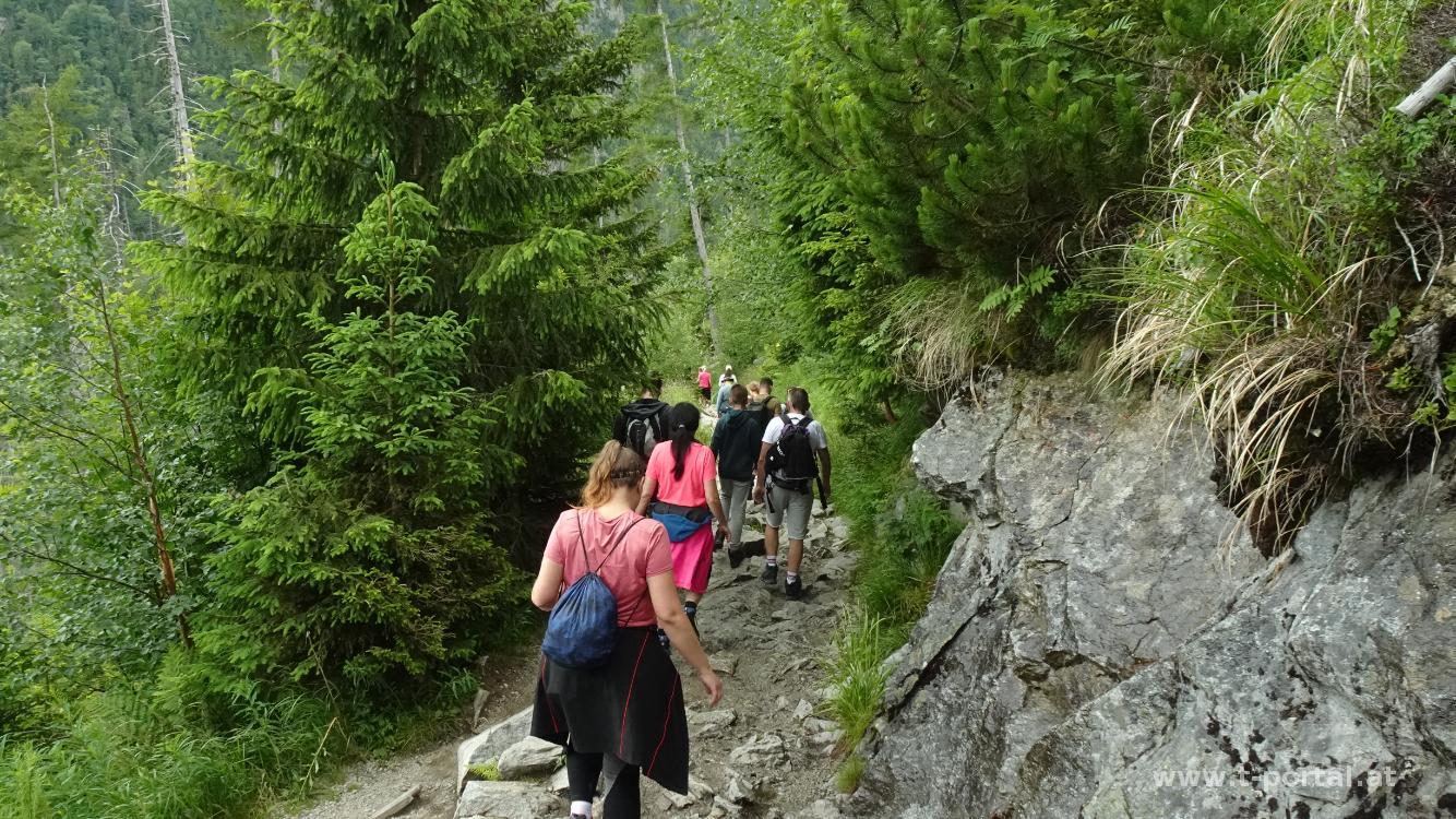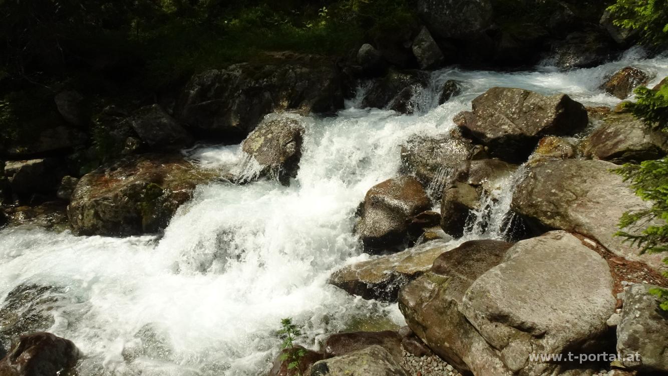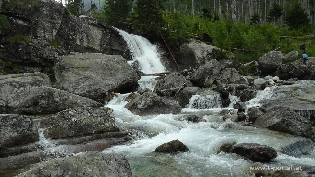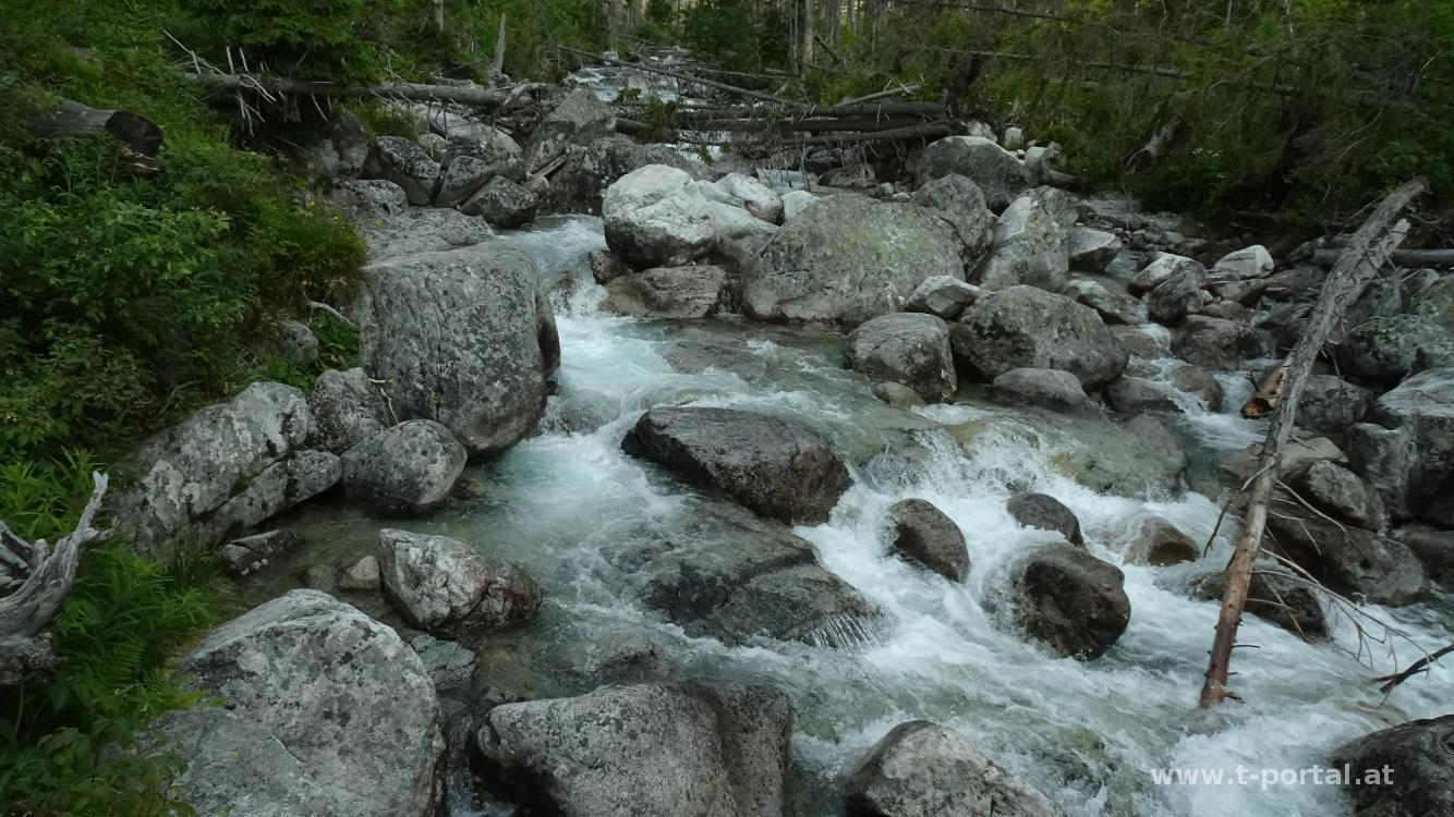 Somit gehen wir an der Hütte vorbei am gleichen Weg wieder zurück. Nachdem es entlang des Bachs wieder schöner wird, legen wir hier noch eine Rastpause ein. Danach geht es teilweise im Gänsemarsch zurück zur Brücke in der Nähe der Rainerova Chata. Von dort gehen wir nicht zurück zum Hrebienok sonden wählen den Wanderweg entlang des Bachs ins Tal. Hierbei kommt man einige Mal recht nahe zum Wasser und so turnen wir für ein paar Fotos über Felsen. Der Abstieg führt uns nach Tatranská Lesná, von wo wir mit der Bahn zurück zum Ausgangspunkt fahren.