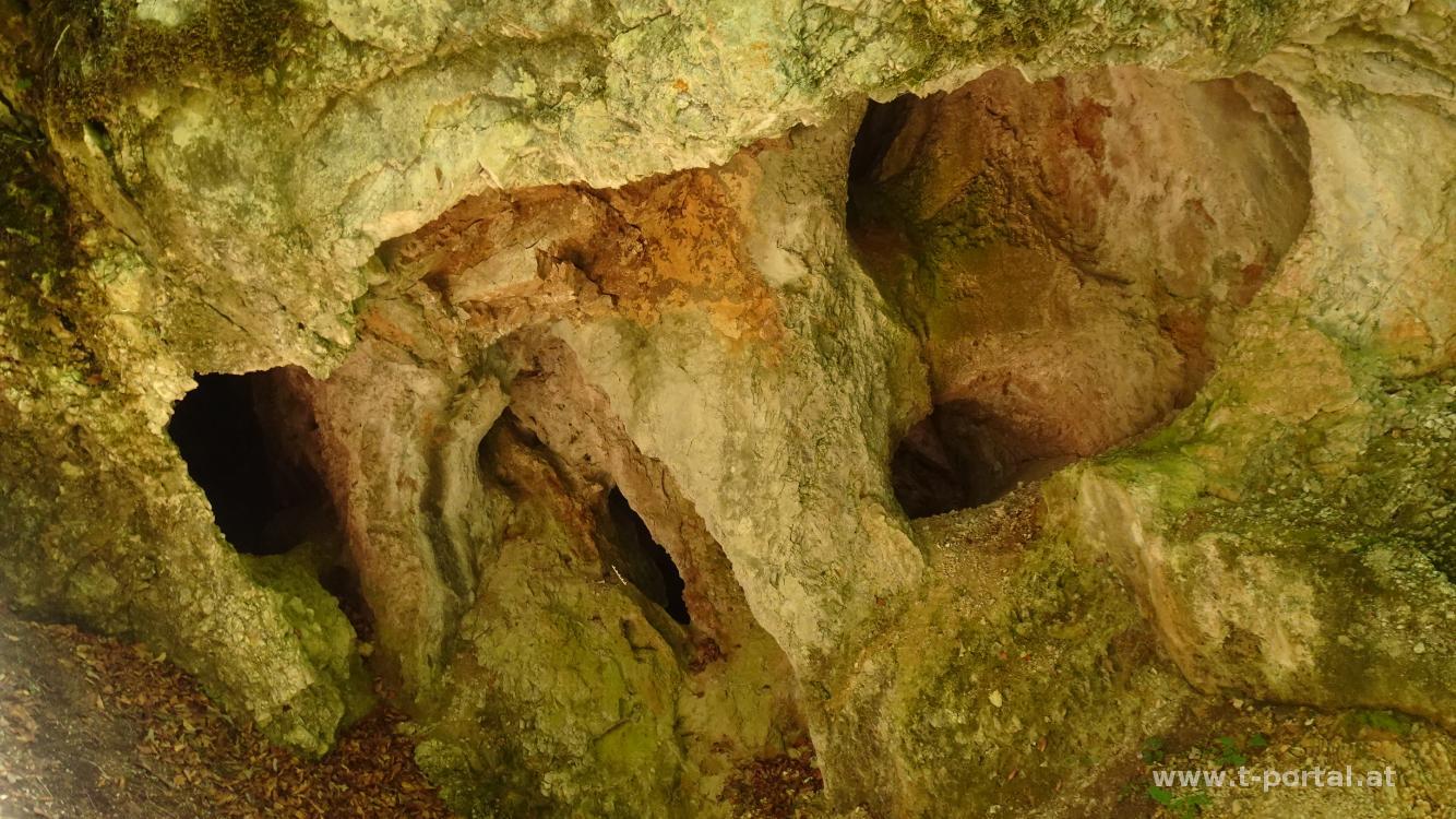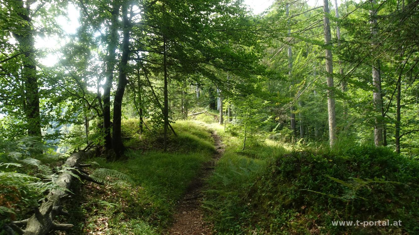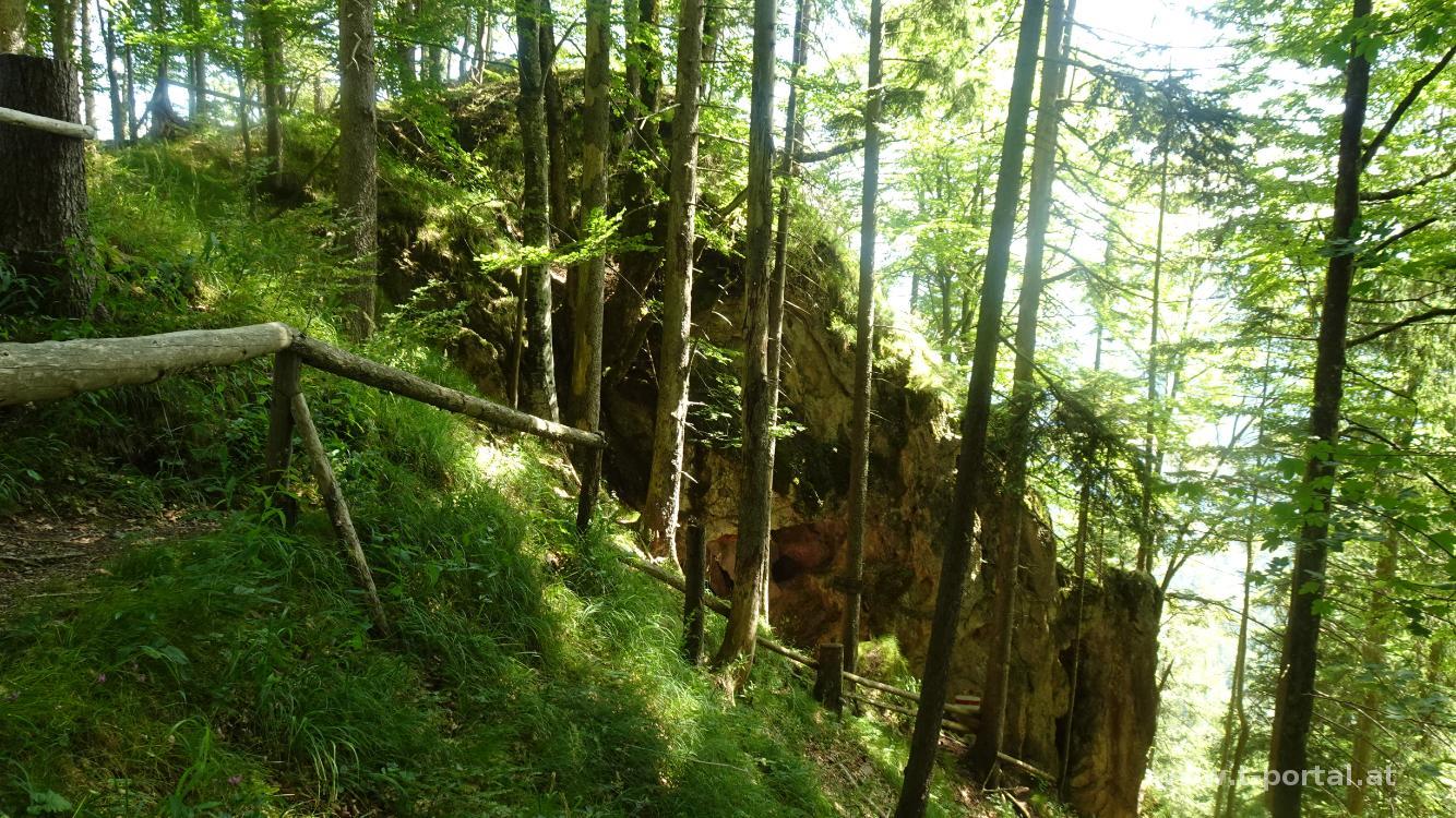 Nach der anstrengenden Tour von gestern geht es heute gemütlicher zu: Nachdem Sonntag ist, gehen wir in die Kirche :-) Nach dem Frühstück fahren wir nach Sankt Gallen und parken uns dort am Hauptplatz ein. Es geht ein Stück auf der Straße zurück und dann bei der großen Schildersammlung nach rechts hinauf in Richtung Teufelskirche. Nach ein paar Minuten kommen wir zu einer Kapelle, dahinter deutet ein Wegweiser nach links. Nun geht es auf Asphalt bei guter Wärme aufwärts bis zu einem Bauernhof. Markierungen gibt es hier keine, das GPS hilft uns auf den Kreuzungen. Vom Bauernhof geht es auf einem Forstweg weiter, im Wald zeigt ein Schild bald nach links um eine Kehre und weiter aufwärts. Es wird steiler, dafür aber auch schattig. Weiter oben wenden wir uns etwas nach rechts (sonst gehts nämlich wieder hinab) und finden einige Zeit später doch nochmal ein Schild. Nun verlassen wir den breiten Pfad und es geht auf einem schönen Waldpfad weiter hinauf. Nach weiterem Anstieg erreichen wir eine Kreuzung und gehen noch ein Stück weiter zur Teufelskirche.