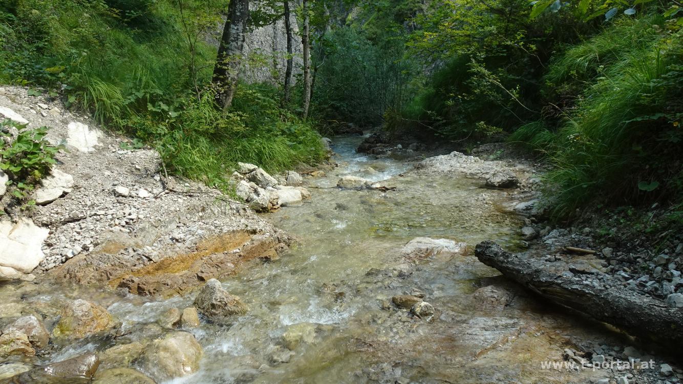 Der Name dieser Felsformation mit einigen Löchern, die man auch von innen betrachten kann, beruht auf einer Sage: Nachdem hier Trinkgelage und Gotteslästerung stattfanden trat eines Tags der Teufel empor und nahm die ganze Gesellschaft mit, ihre Angehörigen fanden nur mehr das Loch im Felsen, so groß wie eine Kirche. Nachdem wir die Kirche lang genug inspiziert hatten, machten wir noch eine Jausenpause am nahen Bankerl und wanderten dann wieder zurück zur letzte Kreuzung. Von dort geht es am Waldweg hinab zu einer Forststraße und auf dieser einige Kilometer bis zur Klammbrücke über den Spitzenbach. Wir folgen nun der Forststraße durch die Klamm und suchen uns einen Platz, bei dem wir bis zum Wasser kommen.