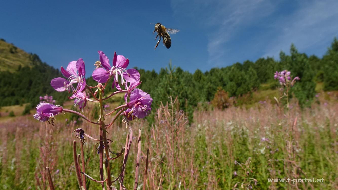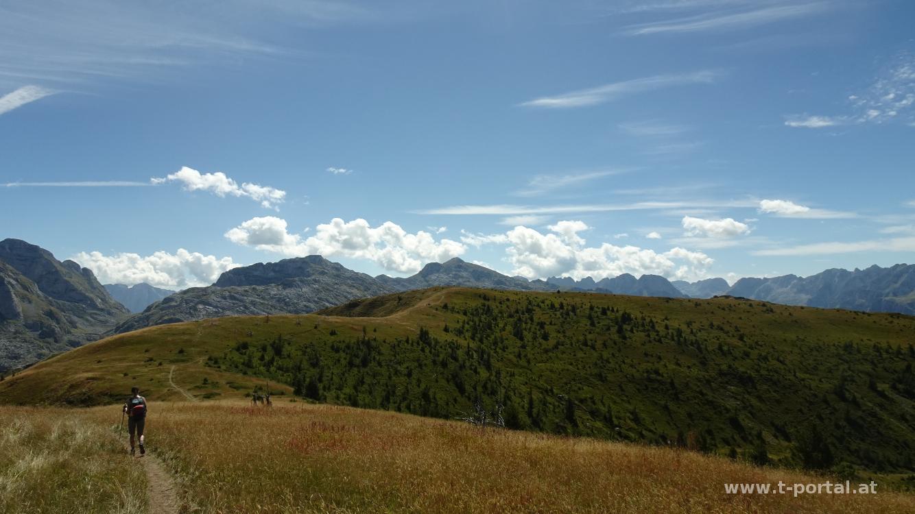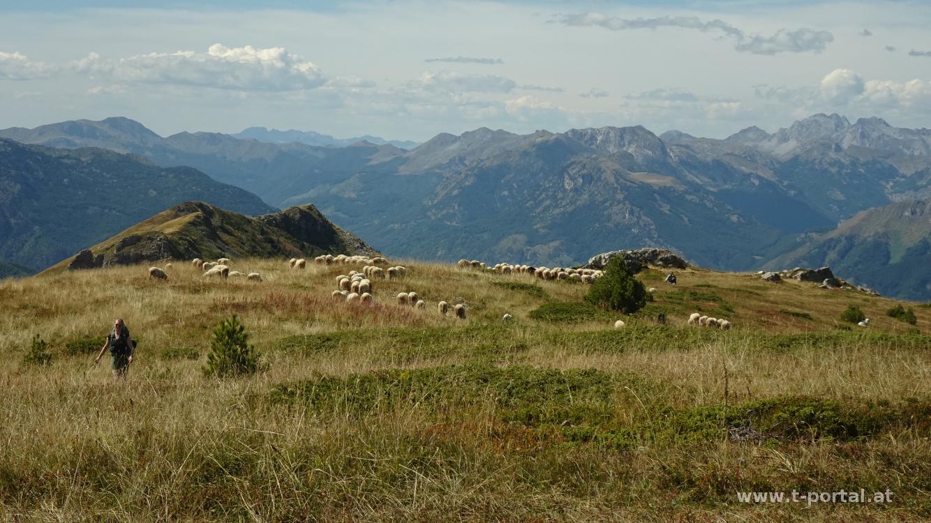Anschließend geht es durch viele Blumen und hoch zu einem Sattel. Von hier folgt der steile Anstieg hinauf zum Plav-Blick und wenig später auch zum Bajrak. Hier legen wir unsere Mittags-Jausen-Pause ein und genießen das Panorama. Irgenwann wird es uns dann in der prallen Sonne zu warm und wir wandern ein Stück hinab und dann am Kammweg weiter bis zum Bora. Von hier geht es nun nach Süden hinab direkt auf das Kolata-Massiv zu. Vorbei an ein paar ausgetrockneten Seen erreichen wir eine Wegkreuzung: Nach Osten könnte man nach Cerem gehen, nach Süden nach Valbona und nach Westen wandern wir weiter nach Vusanje.