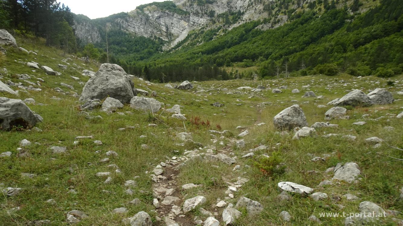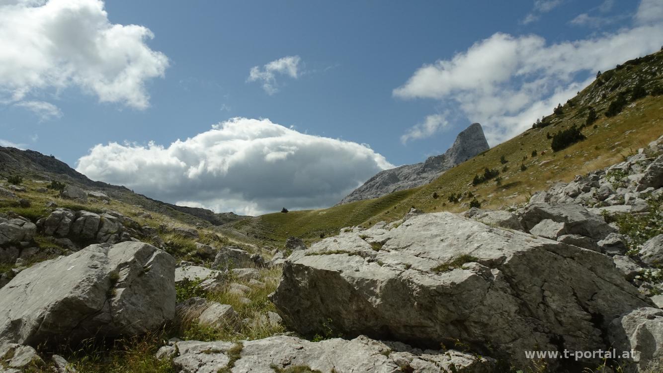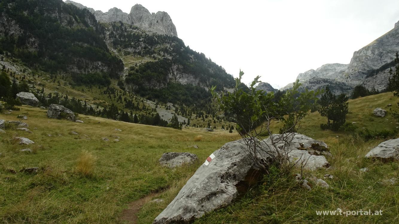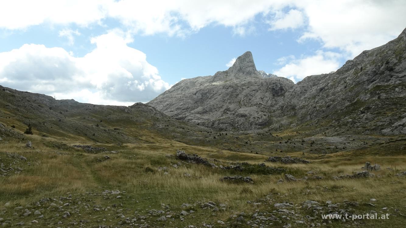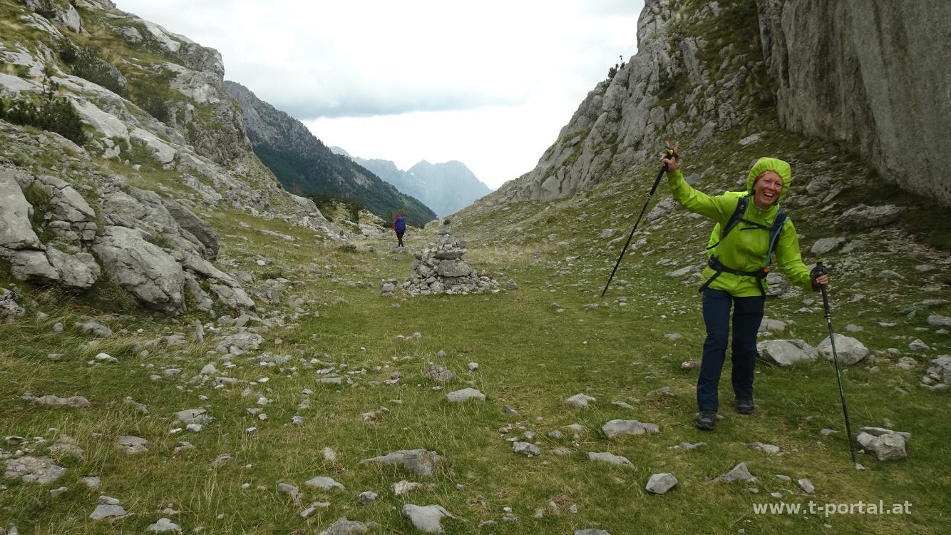 Nach dem See verlassen wir Montenegro und wandern in Albanien bald hinein in den Wald und hier in ein paar Kurven aufwärts. Wir kommen den Felsen ein Stück näher und nach einer steinigen Passage erreichen wir die grasige Fläche. Hier bläst ordentlich der kalte Wind und wir schauen, das wir weiterkommen. Wir kommen an einem Rastplatz vorbei, den wir aufgrund des Winds aber auslassen und lassen uns weiter nach Süden blasen. So geht es am Pfad weiter aufwärts, bis hoch zum nächsten Sattel. Wir blicken zu einer Felsformation, die von der Ferne wie ein Wanderschuh aussieht und passieren ein paar Barracken. Hinter den Felsen wird der Wind manchmal weniger, bald bläst es aber wieder ordentlich.