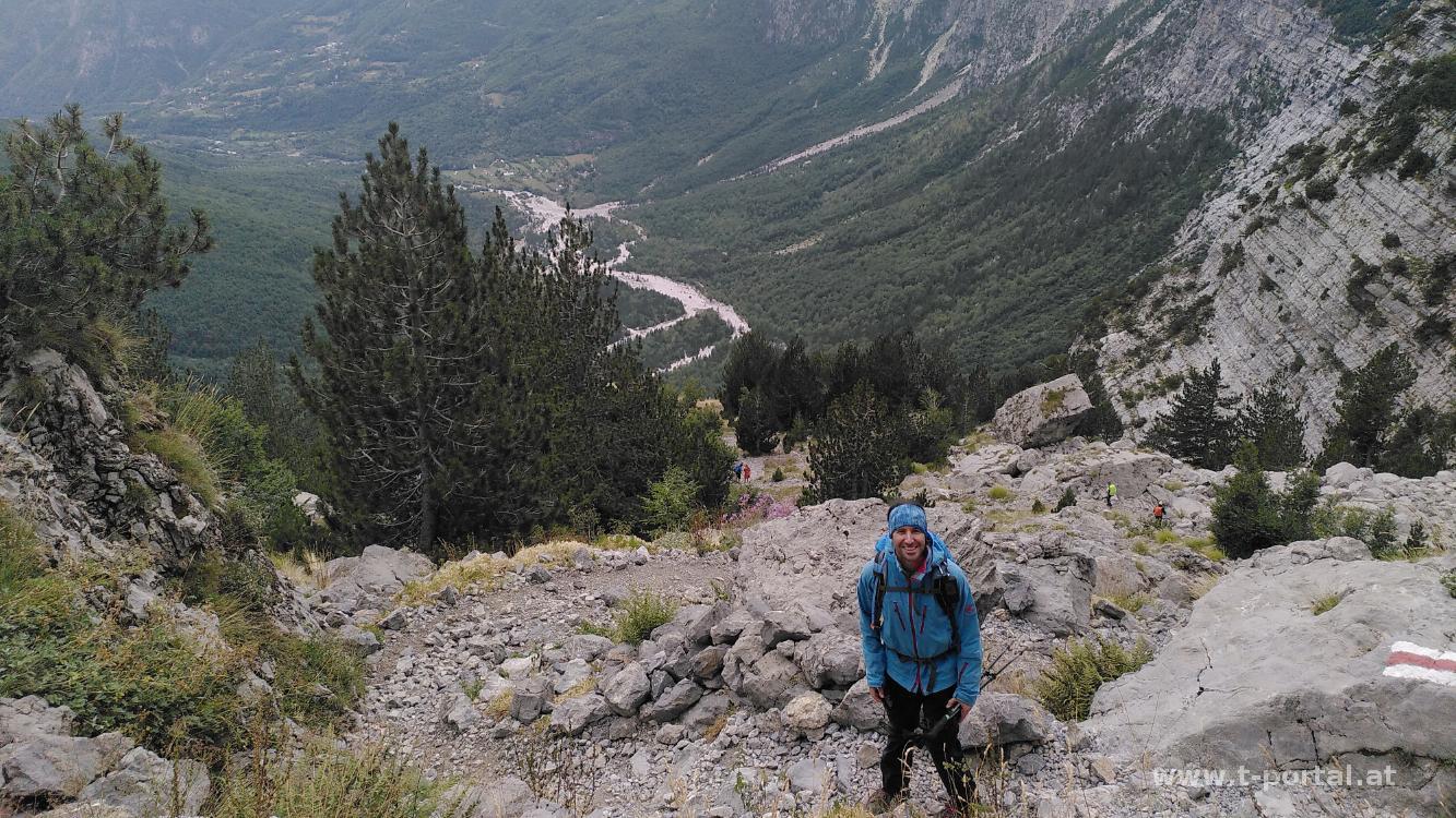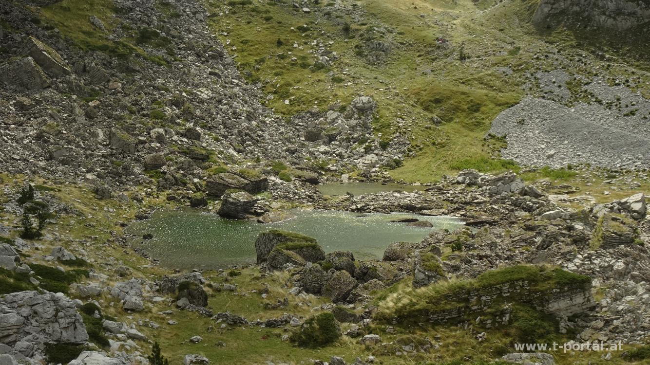 Es geht noch ein Stück hinauf zum höchsten Punkt des Tages und auf der anderen Seite ein Stück hinab zu zwei Seen. Danach geht es nochmal knappe 100 Höhenmeter hinauf, wo wir endlich die andere Bergseite erreichen. Nachdem es hier weniger bläst legen wir eine Jausenpause ein und beginnen dann den Abstieg nach Theth. In vielen Kehren geht es über Schutt und Gestein steil hinab. Wir kommen an einigen steilen Wänden vorbei und erreichen schlussendlich einige Schuttrinnen. Entlang dieser wandern und rutschen wir hinab bis zum Bach, wo wir unsere Füße kurz abkühlen. Auf der Straße geht es nun in Richtung Theth, wobei unser Quartier aber schon etwa 1,5km vor dem Ortszentrum liegt.